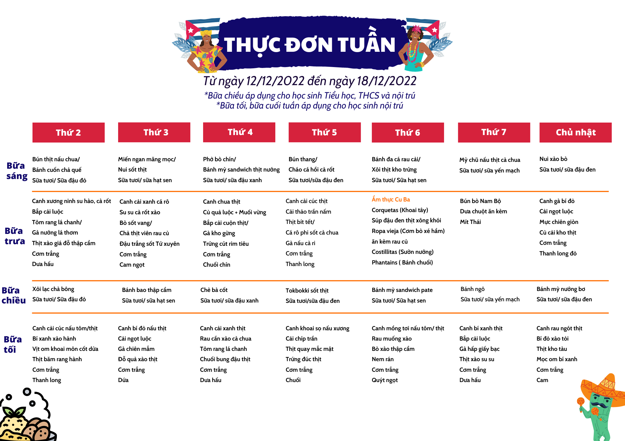 Thực đơn từ ngày 12/12/2022 đến ngày 18/12/2022