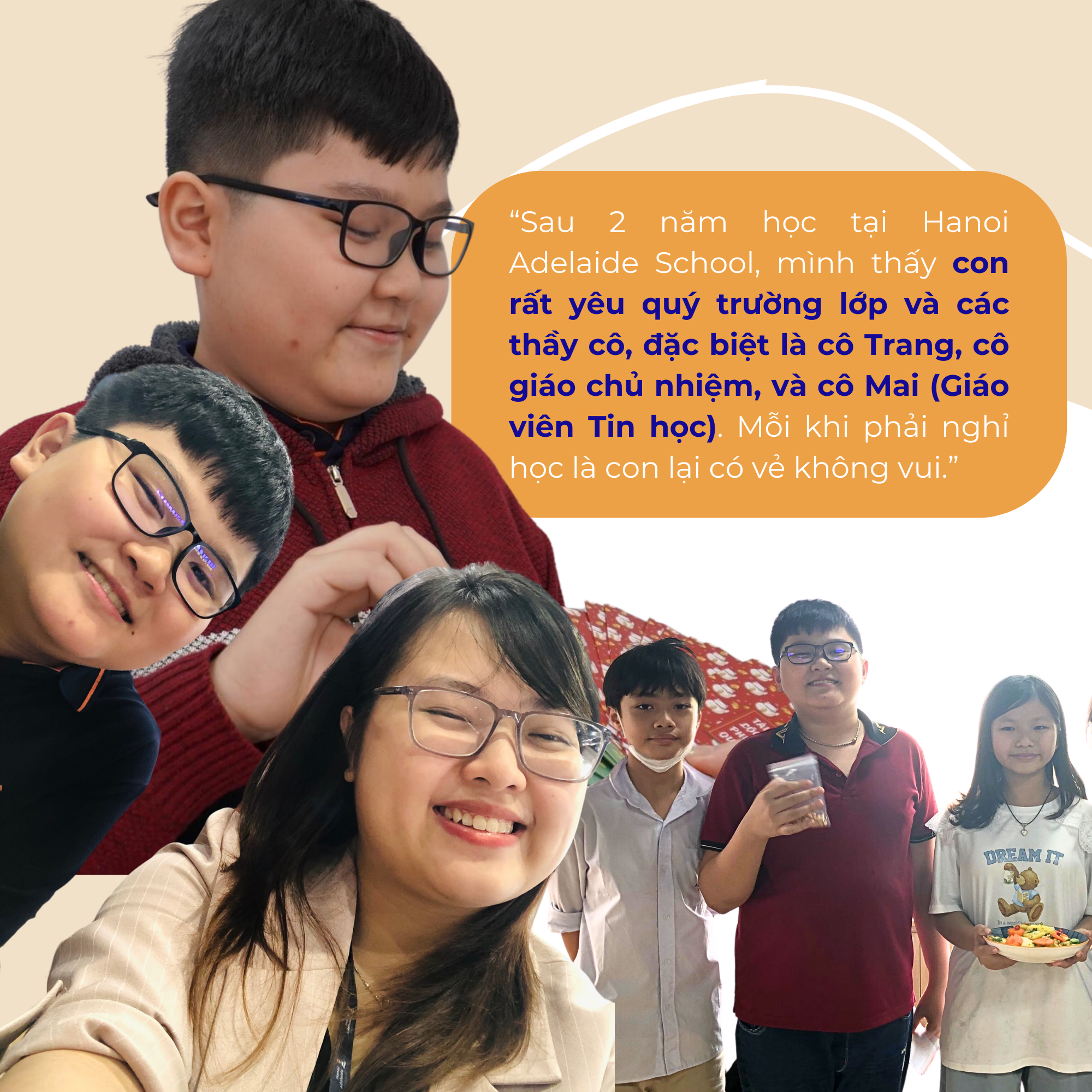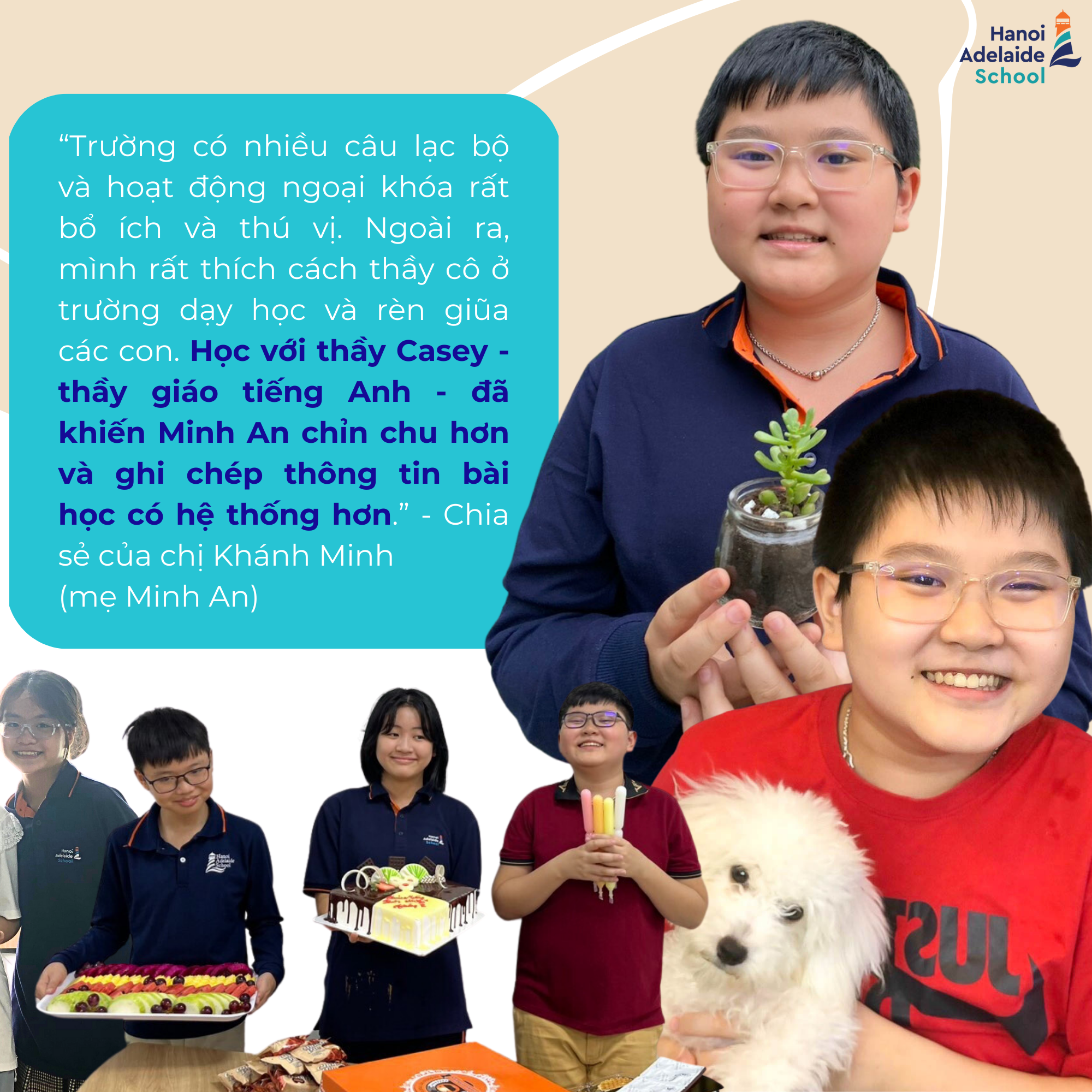 Điểm nổi bật của Minh An không chỉ ở vốn kiến thức rộng rãi, niềm say mê đọc sách truyện tiếng Anh mà chính là sự chuyển mình thay đổi tích cực với minh chứng rõ nét là giải thưởng Gương mặt tháng 12 của lớp 6H1. Với sự tiến bộ mạnh mẽ trong học kì I, khi năng lực học tập được khắng định, cậu bạn dần trở nên hăng hái trong mọi hoạt động, điển hình là việc mạnh dạn đăng kí tham gia thi đấu cầu lồng trong ngày hội thể thao của trường. Không còn quá nhút nhát, giờ đây, Minh An năng nổ tham gia các hoạt động thể thao, luôn cảm thấy vui vẻ và hạnh phúc vì ở ngôi trường Hanoi Adelaide School có nhóm bạn thân “hợp cạ” và các thầy cô giáo rất hiểu mình. Minh An cũng chia sẻ thêm, nhờ có những bữa ăn dinh dưỡng và ngon như cơm mẹ nấu tại trường, cậu bạn có thêm năng lượng cho các hoạt động học tập mỗi ngày.