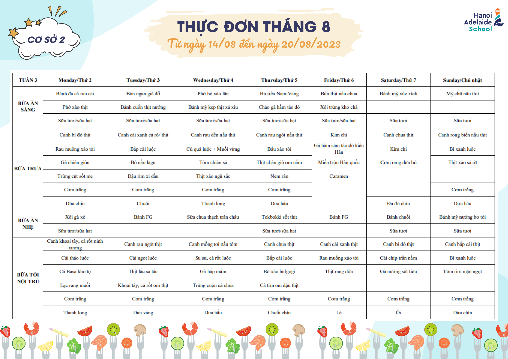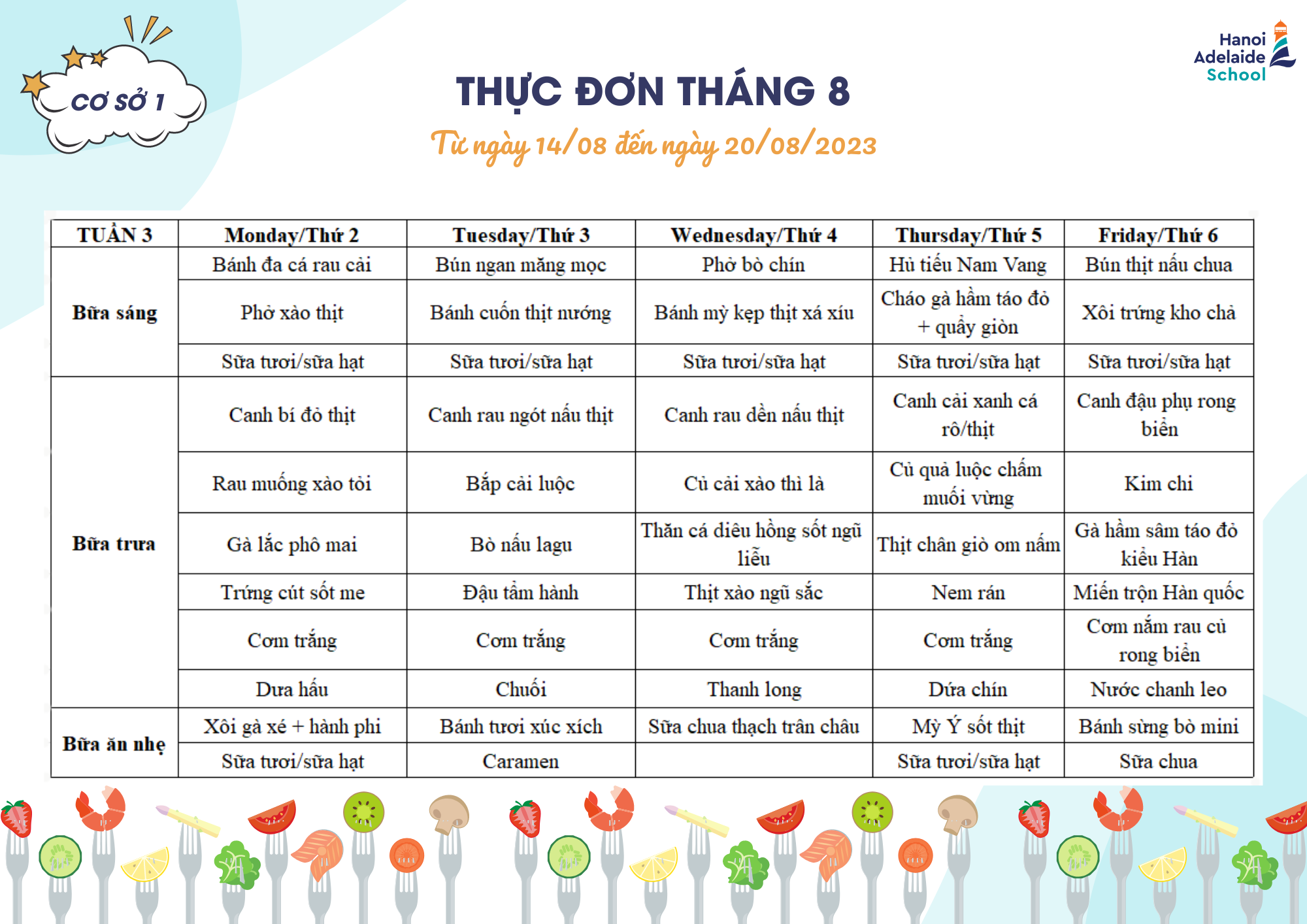 Thực đơn từ ngày 14/08 đến ngày 20/08/2023