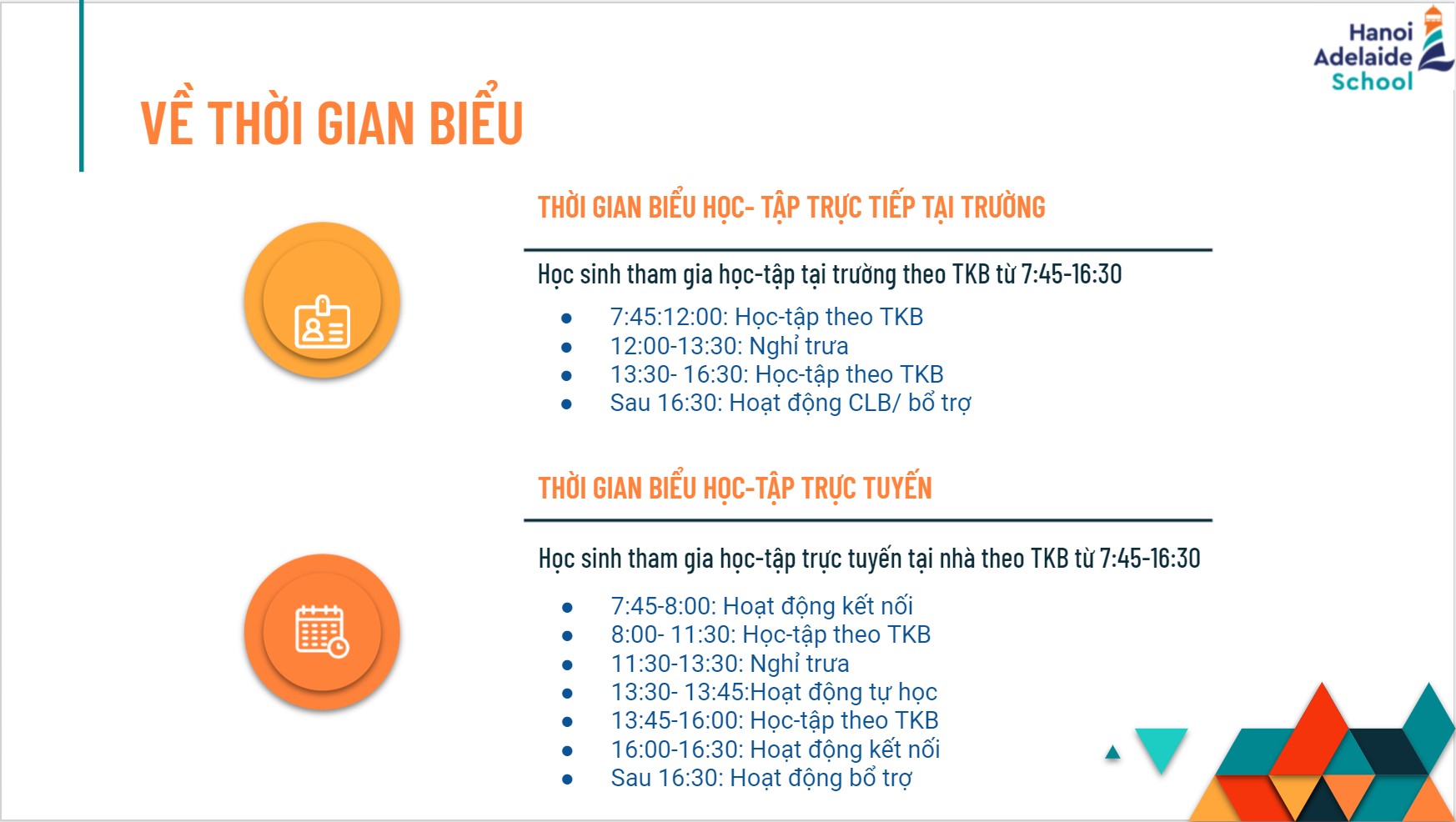 Hanoi Adelaide School là một trong số những ngôi trường thích ứng nhanh và chủ động với việc học trực tuyến. Vì vậy, năm học 2021-2022, Nhà trường đã xây dựng chương trình, sẵn sàng đáp ứng trước diễn biến phức tạp của dịch bệnh, nhằm đảm bảo thời lượng học-tập, đảm bảo việc hoàn thành mục tiêu học tập của học sinh.