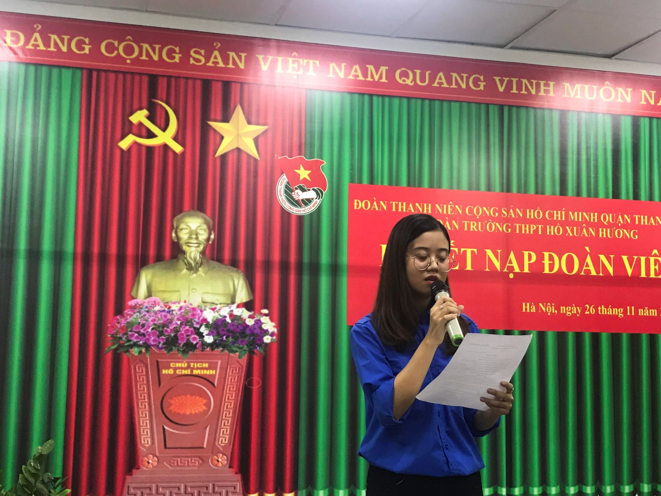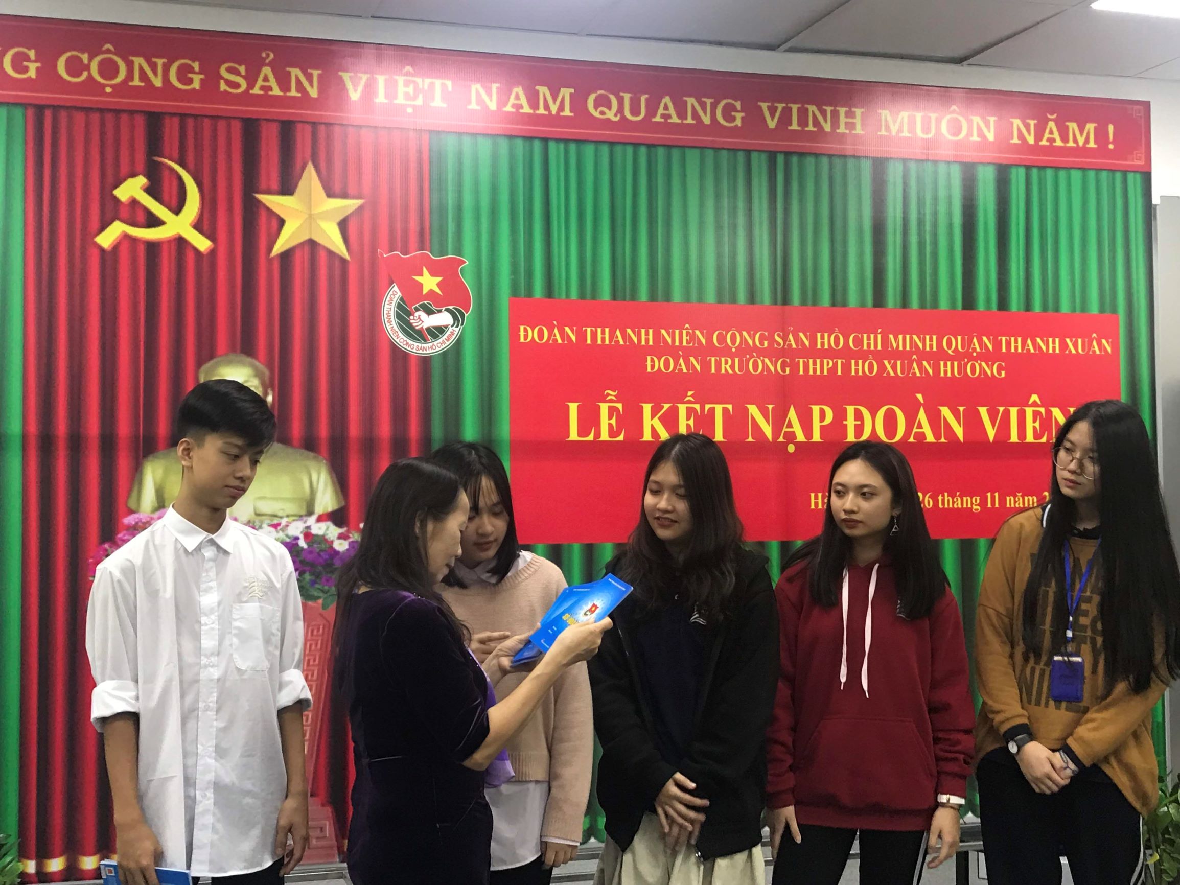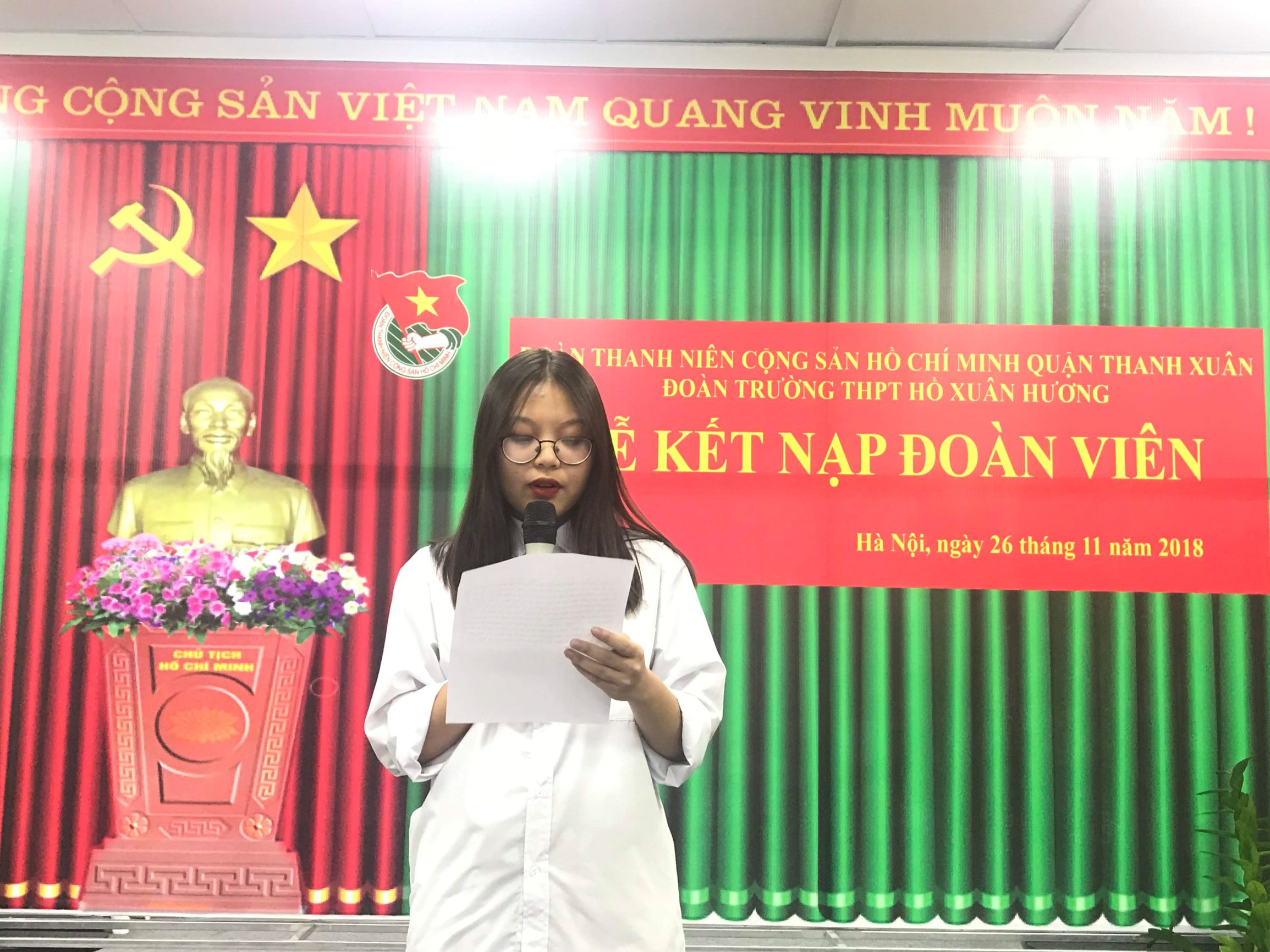 Sáng thứ 2, ngày 26/11/2018, tại Thư viện THPT, Đoàn trường THPT Hồ Xuân Hương tổ chức Lễ kết nạp Đoàn viên đợt 1 năm học 2018-2019. Buổi lễ diễn ra trong không khí trang nghiêm với sự có mặt của cô giáo Lương Thị Hồng Thu – Bí thư chi bộ, Hiệu trưởng nhà trường; đồng chí Hoàng Thị Như Quỳnh – Bí thư Đoàn trường; 15 thanh niên ưu tú và học sinh lớp 10 toàn trường.