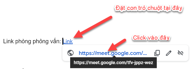 • Trước thời điểm phỏng vấn 5 phút, thí sinh đăng nhập vào phòng phỏng vấn, bằng cách click vào đường link theo các bước, như ảnh dưới.
