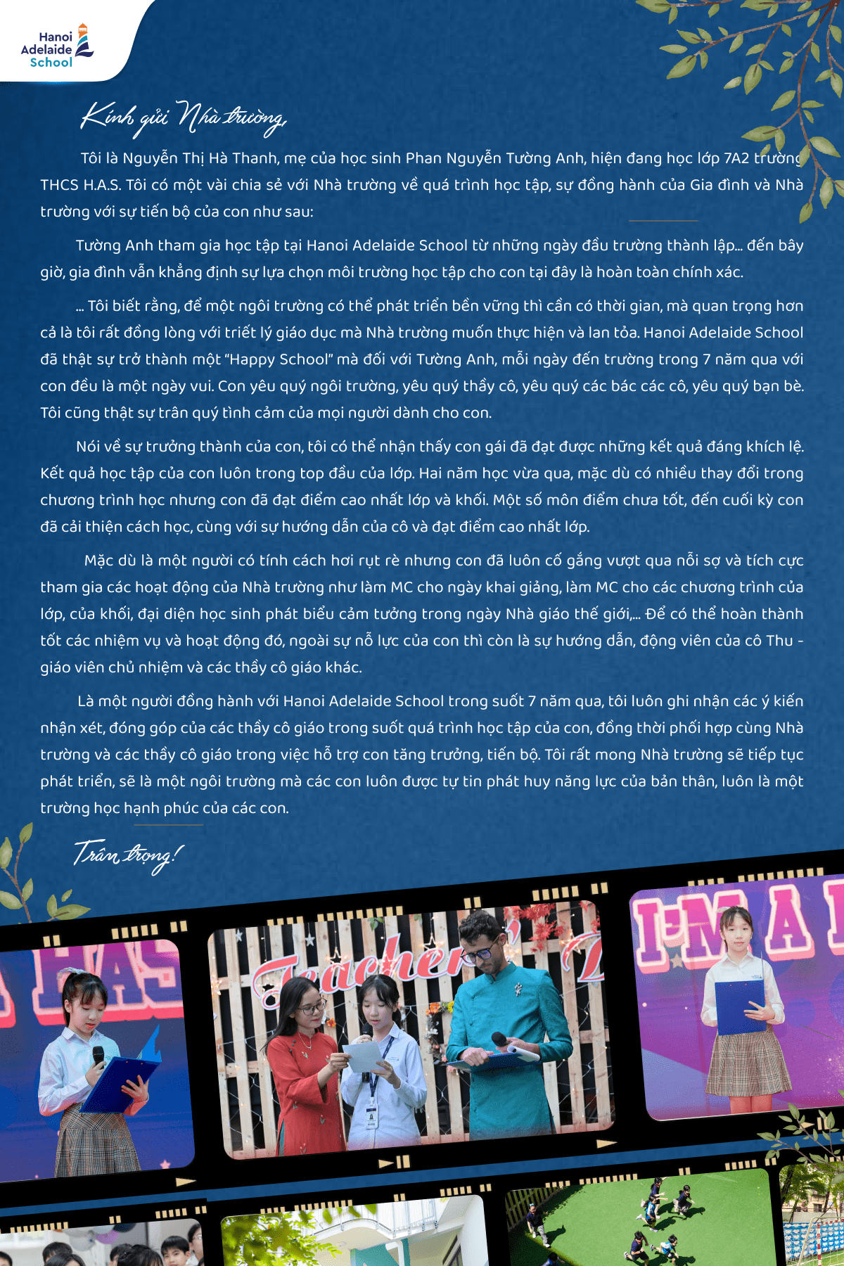Xin cảm ơn những tình cảm trân quý của mẹ Tường Anh! Sự tiến bộ của các con và sự tin tưởng đồng hành của quý cha mẹ là nguồn động viên to lớn để Hanoi Adelaide School tiếp tục hoàn thành sứ mệnh giáo dục cao cả, chắp cánh cho các thế hệ HASians tự tin bước vào tương lai.