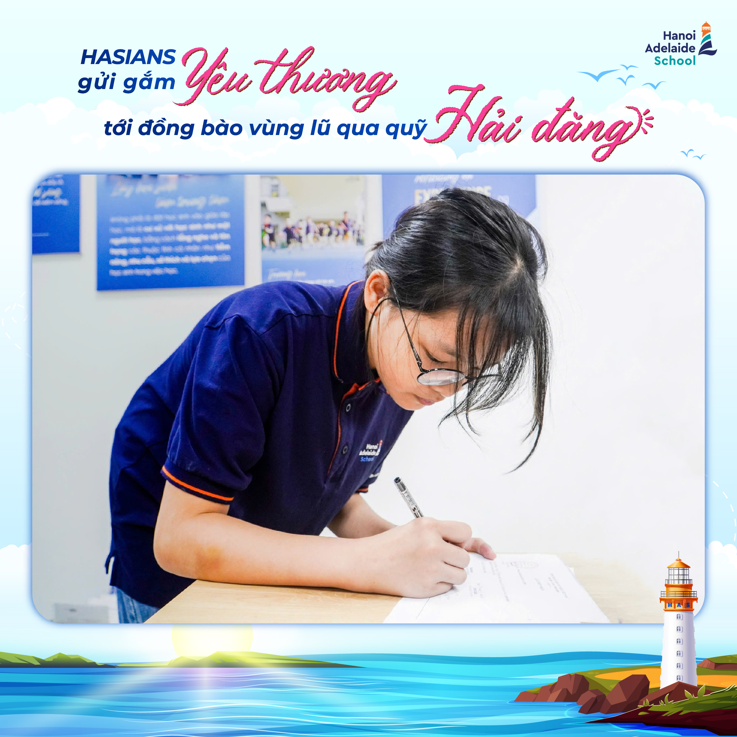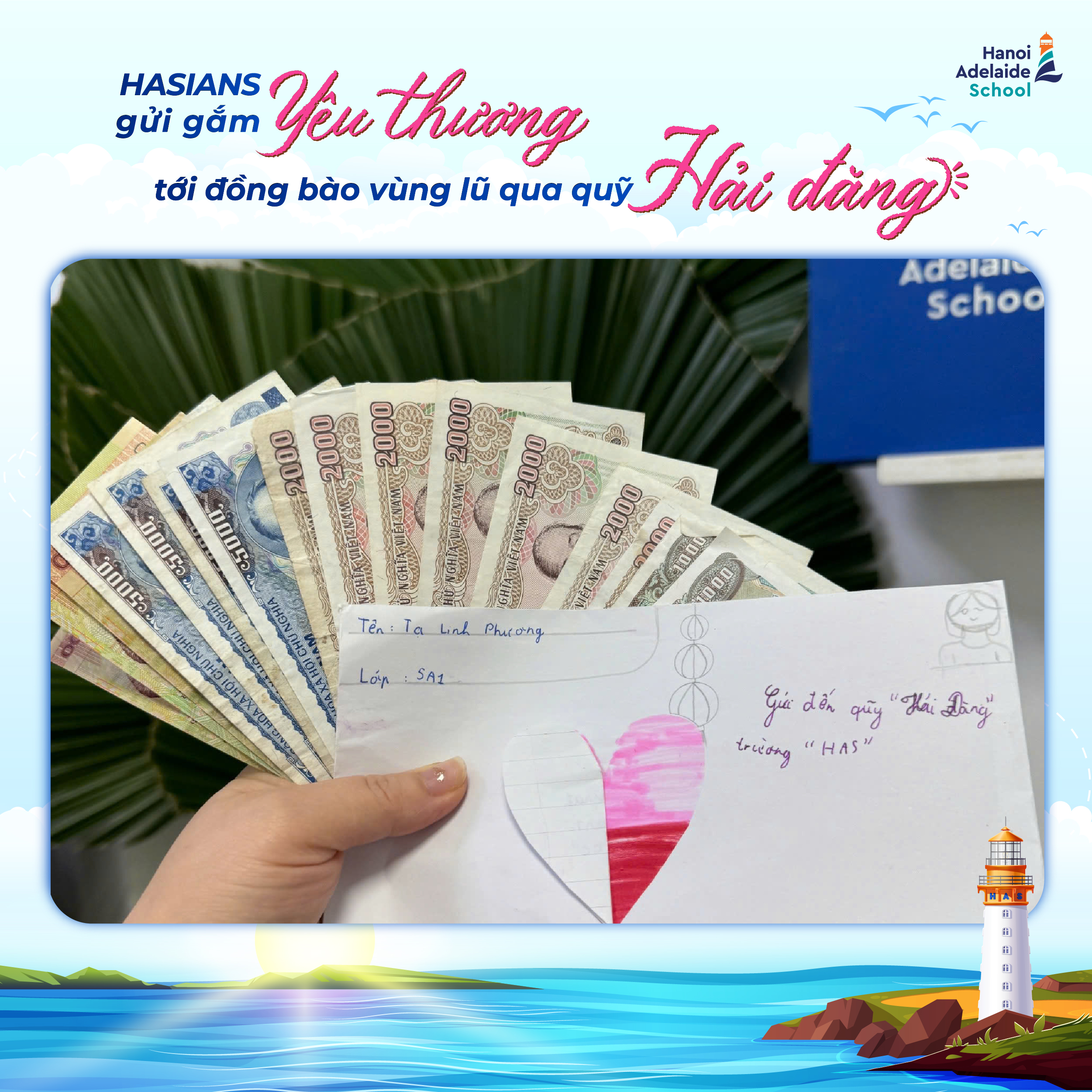 Bằng tất cả tấm lòng chân thành, học sinh tại Hanoi Adelaide School đã có những đóng góp thiết thực vào Quỹ Hải Đăng để gửi tới những hoàn cảnh đang cần sự giúp đỡ: “Con đã “đập lợn” để đóng góp một chút sức nhỏ bằng số tiền tiết kiệm được của mình, mong các bạn sớm vượt qua khó khăn và được quay trở lại trường học ạ.” (Bạn Phạm Quách Gia Tuệ – 7HS1).