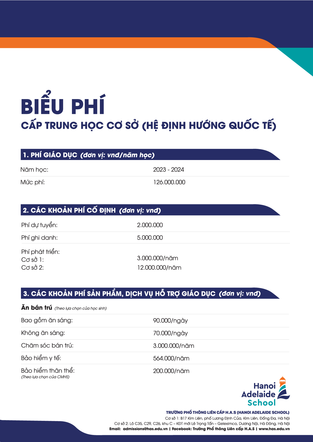 Hanoi Adelaide School trân trọng gửi đến quý Cha mẹ học sinh biểu phí cấp THCS hệ Định hướng Quốc tế năm học 2023-2024