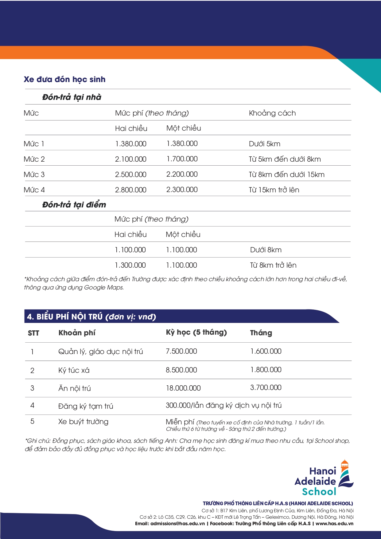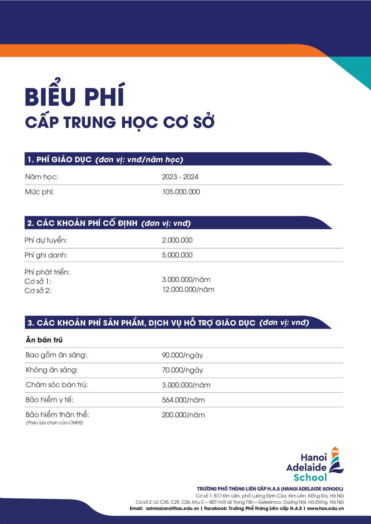 Hanoi Adelaide School trân trọng gửi đến quý Cha mẹ học sinh biểu phí cấp THCS hệ tiêu chuẩn năm học 2023-2024