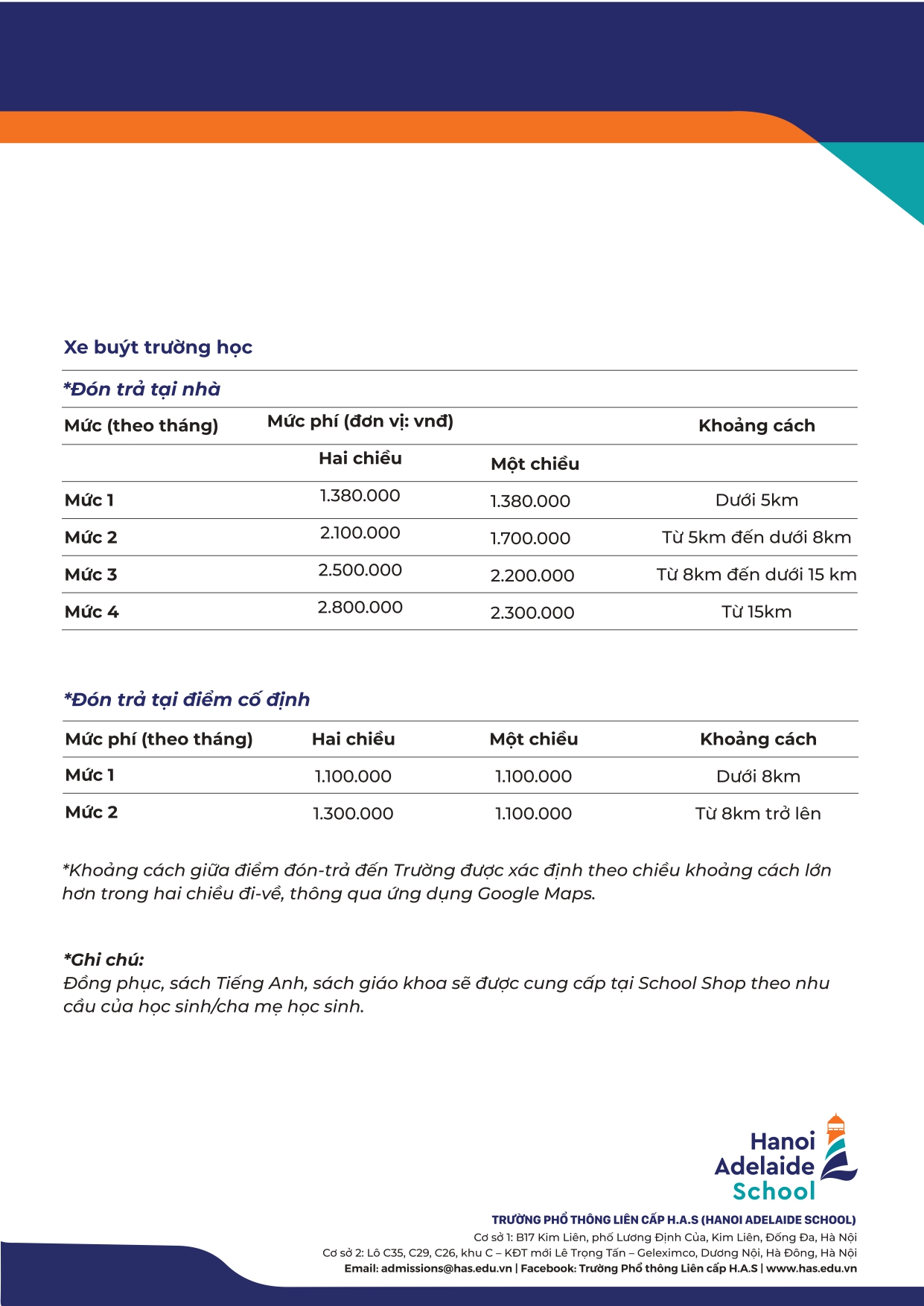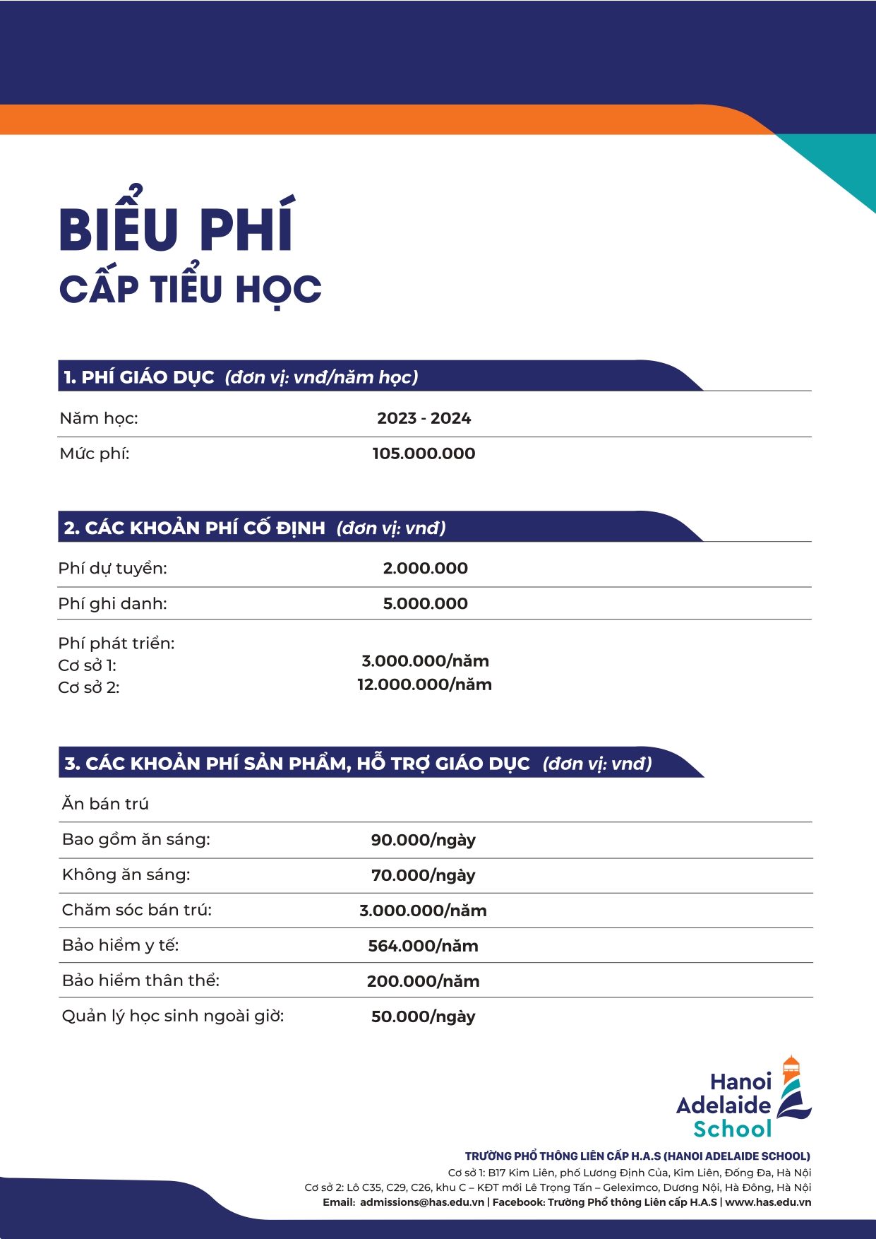 Hanoi Adelaide School trân trọng gửi đến quý Cha mẹ học sinh biểu phí cấp Tiểu học năm học 2023-2024