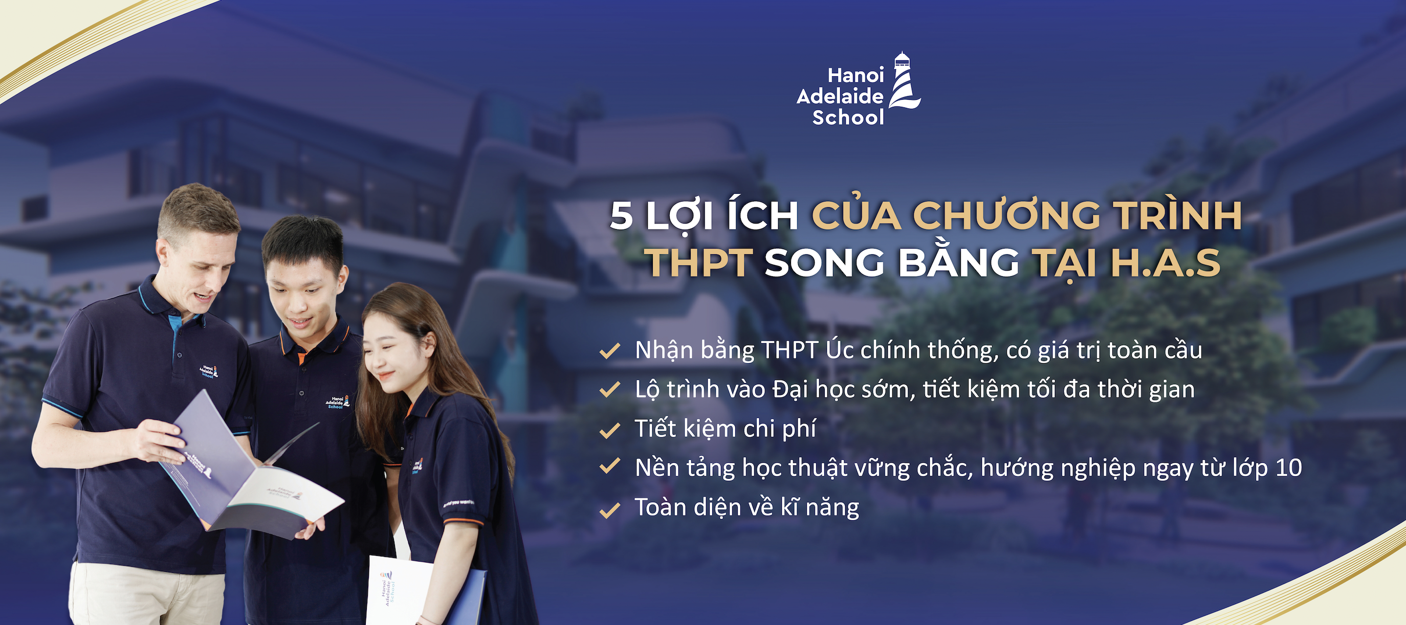 Chương trình Song Bằng tại H.A.S chuẩn bị nền tảng học thuật vững chắc cho học sinh thông qua các môn học 100% bằng tiếng Anh có tính định hướng cao như Đổi mới kinh doanh, Nghệ thuật sáng tạo, Đề án nghiên cứu,…trong môi trường học tập quốc tế với giáo viên bản ngữ giàu chuyên môn sư phạm, được đào tạo và uỷ quyền giảng dạy bởi Uỷ ban THPT Nam Úc. Ngoài ra, học sinh được nhận hỗ trợ từ các cố vấn (mentor) trong suốt quá trình học-tập.
