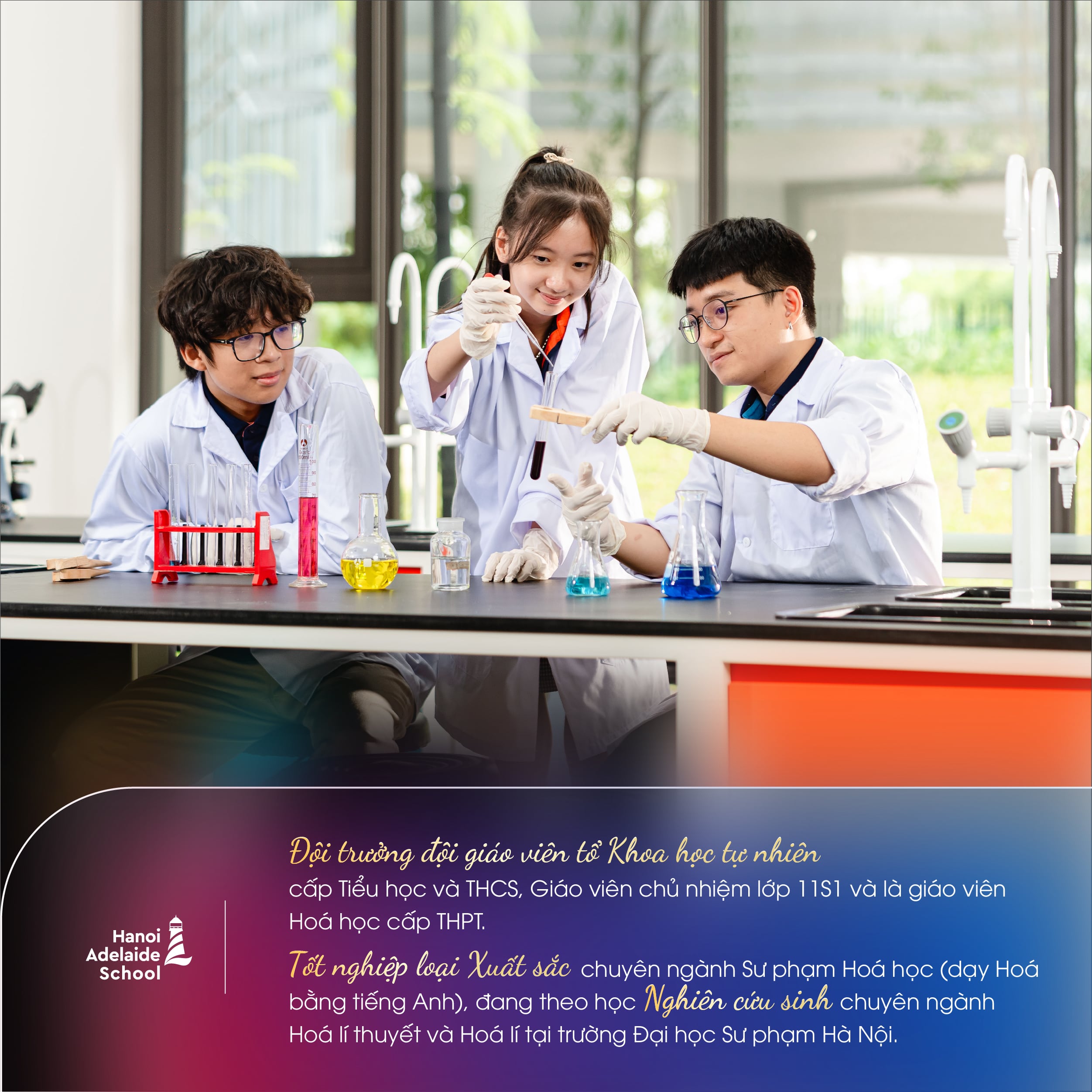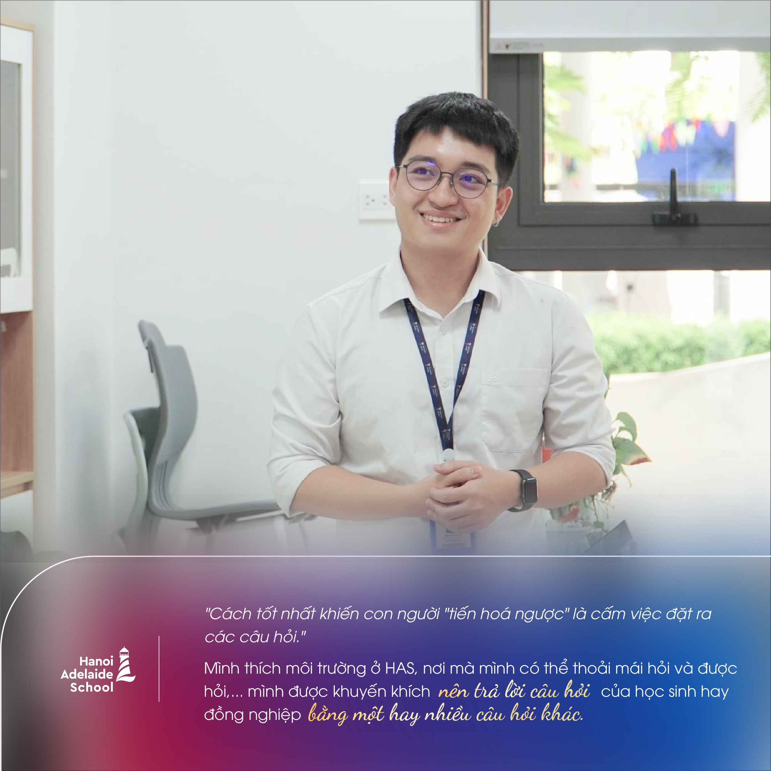 Gắn bó với Hanoi Adelaide School từ những ngày đầu tốt nghiệp đại học, thầy Ngô Hoàng Lân hiện đang là Đội trưởng đội giáo viên Tổ Khoa học Tự nhiên cấp Tiểu học và THCS tại cơ sở Dương Nội. Sở hữu một loạt thành tích đáng nể, thầy Lân đã truyền cảm hứng học-tập Khoa học cho HASians với phương pháp dạy-học thú vị.