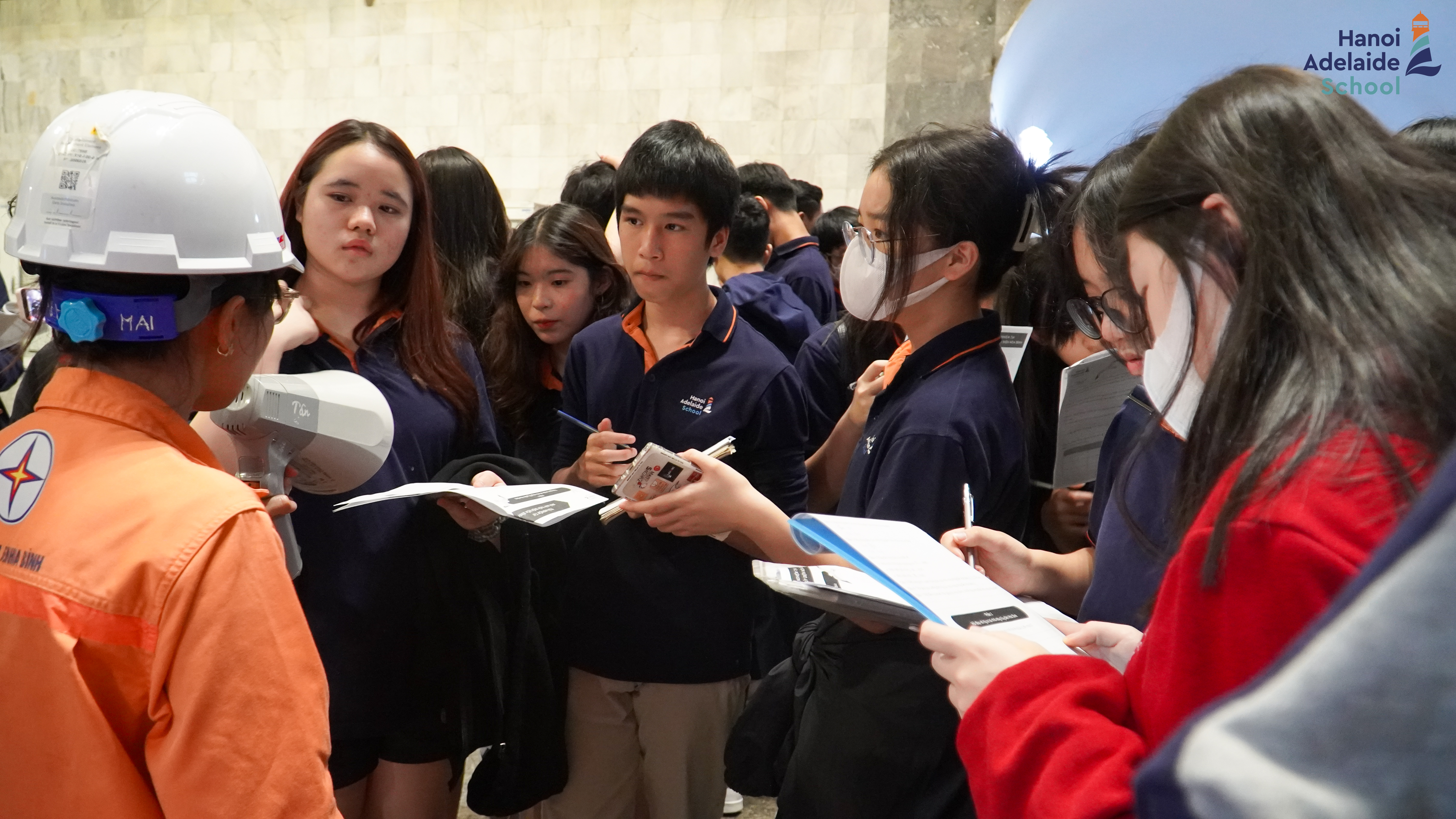 Tại điểm đến đầu tiên – nhà máy Thủy điện Hòa Bình, học sinh được lắng nghe những chia sẻ hữu ích của các cô chú kỹ sư về nguyên tắc hoạt động của nhà máy thủy điện, hoạt động của đập nước và các tua-bin,…Không khí học tập tích cực diễn ra ngay bên cạnh các tổ máy khi HASians chủ động tìm kiếm, chọn lọc thông tin để hoàn thành từng nhiệm vụ học-tập được giao.