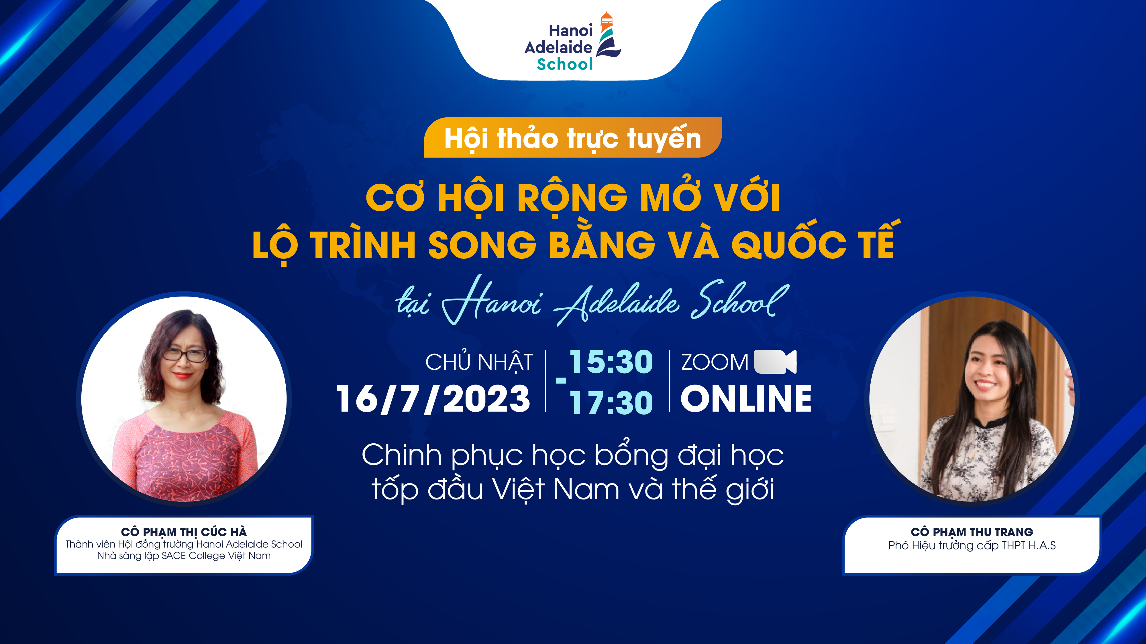 Với mong muốn đồng hành cùng cha mẹ và các bạn học sinh THPT trong hành trình Chinh phục học bổng tại những đại học tốp đầu trong nước và quốc tế, Hanoi Adelaide School tổ chức hội thảo trực tuyến “CƠ HỘI CHO HỌC SINH VIỆT NAM VỚI LỘ TRÌNH THPT SONG BẰNG VÀ QUỐC TẾ TẠI HANOI ADELAIDE SCHOOL”.