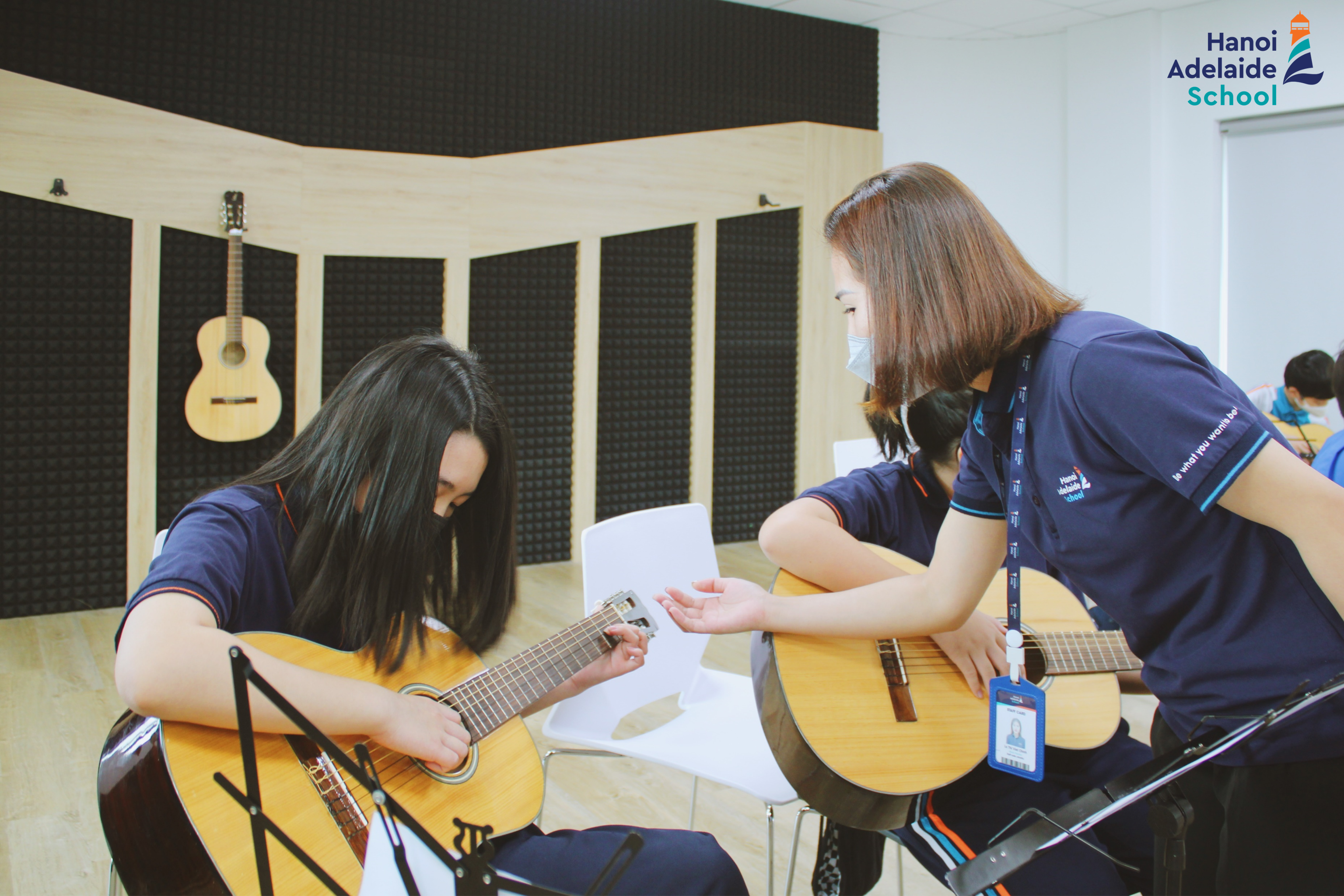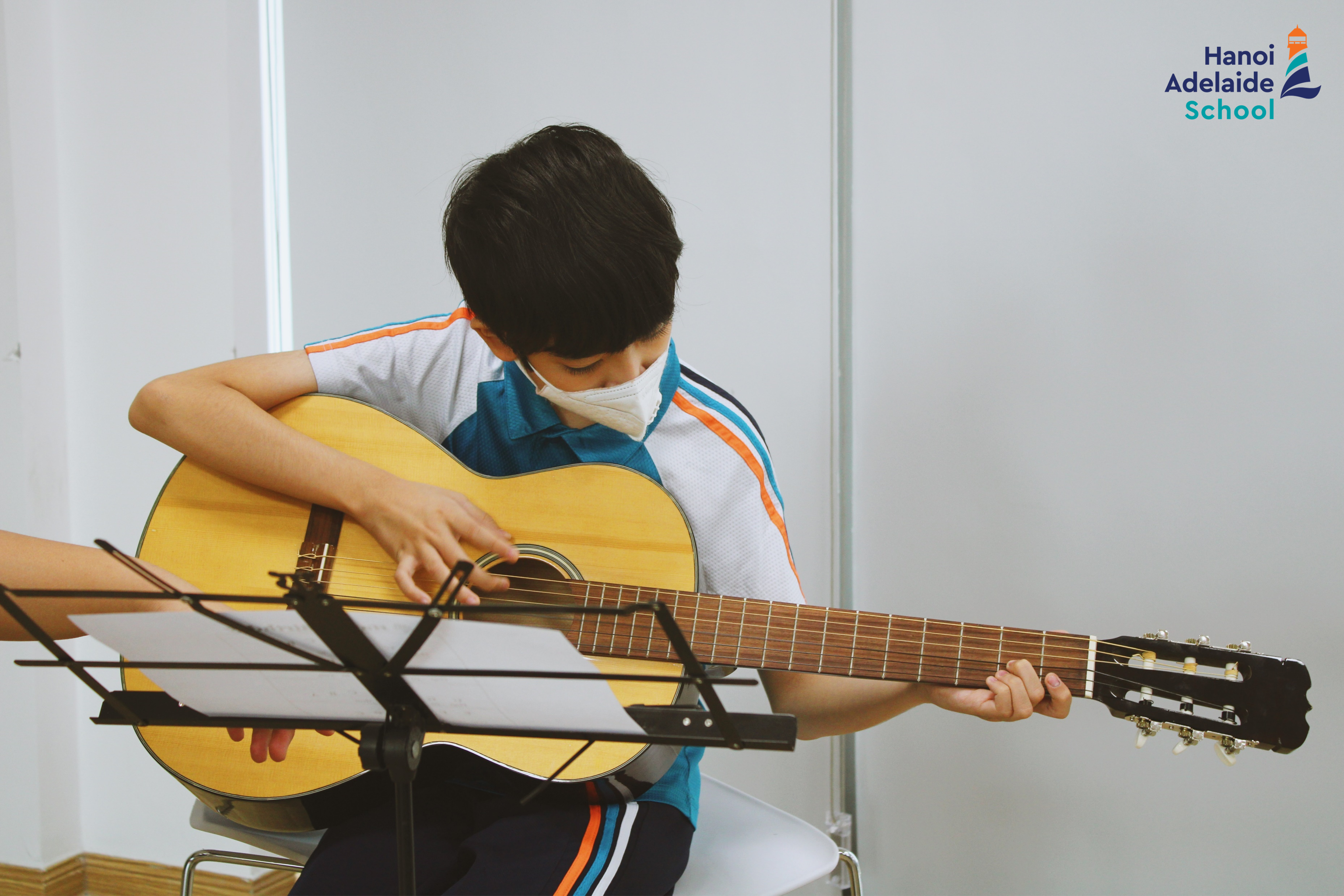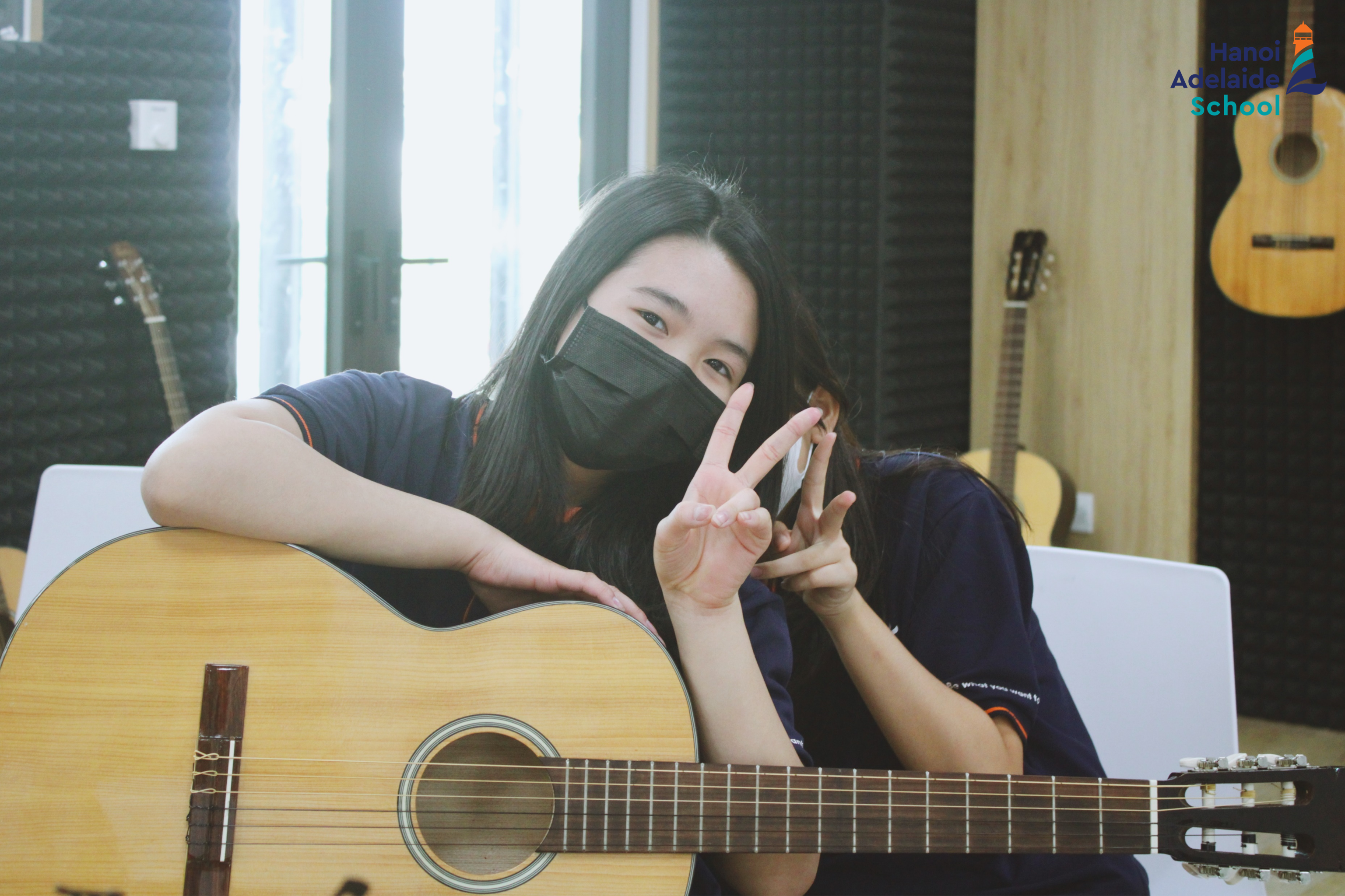 Bên cạnh những giai điệu sôi động, rộn ràng của trống, hay du dương của đàn piano, học sinh Hanoi Adelaide School cũng có những giờ phút “phiêu” cùng với giai điệu mộc mạc của đàn guitar.