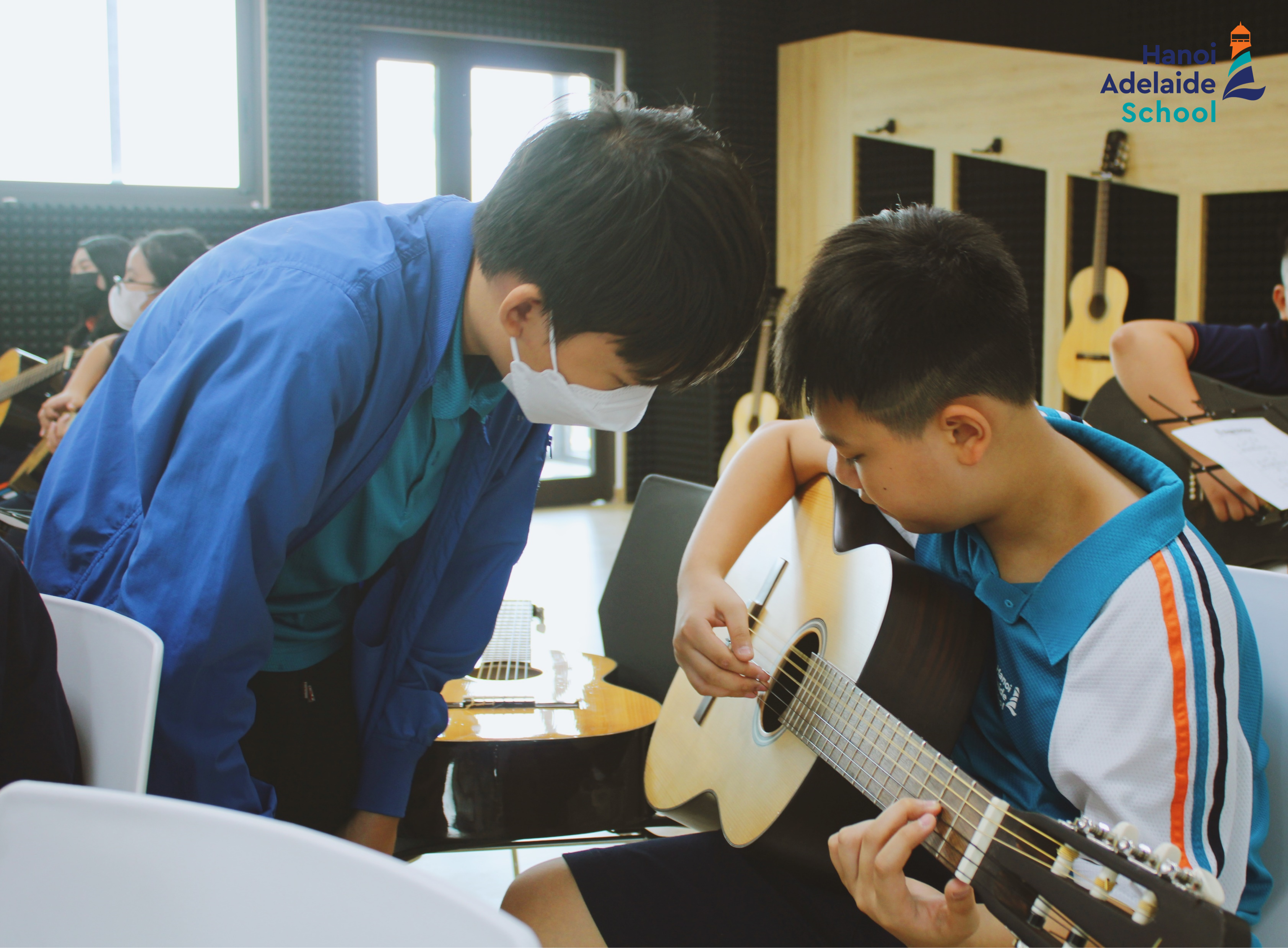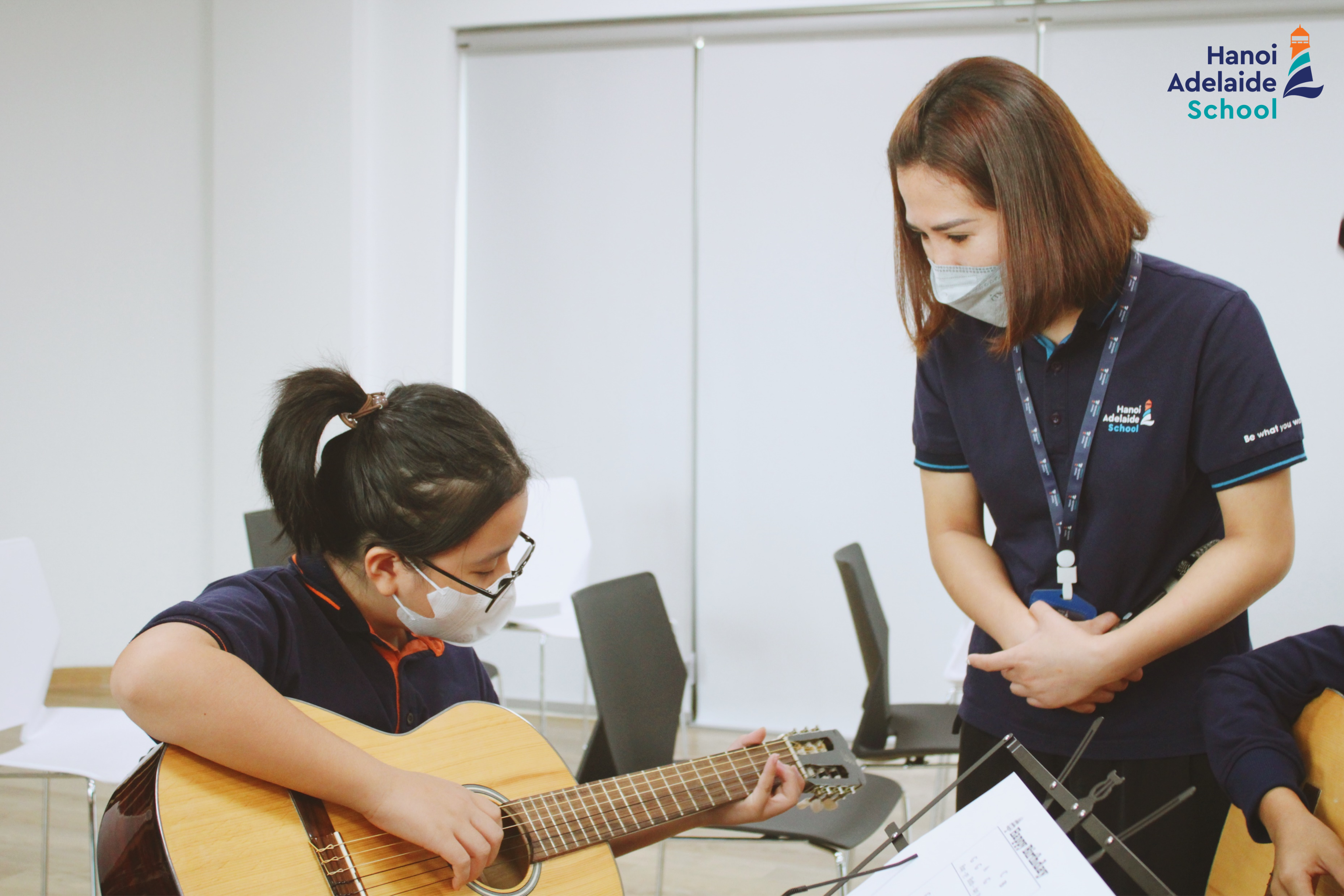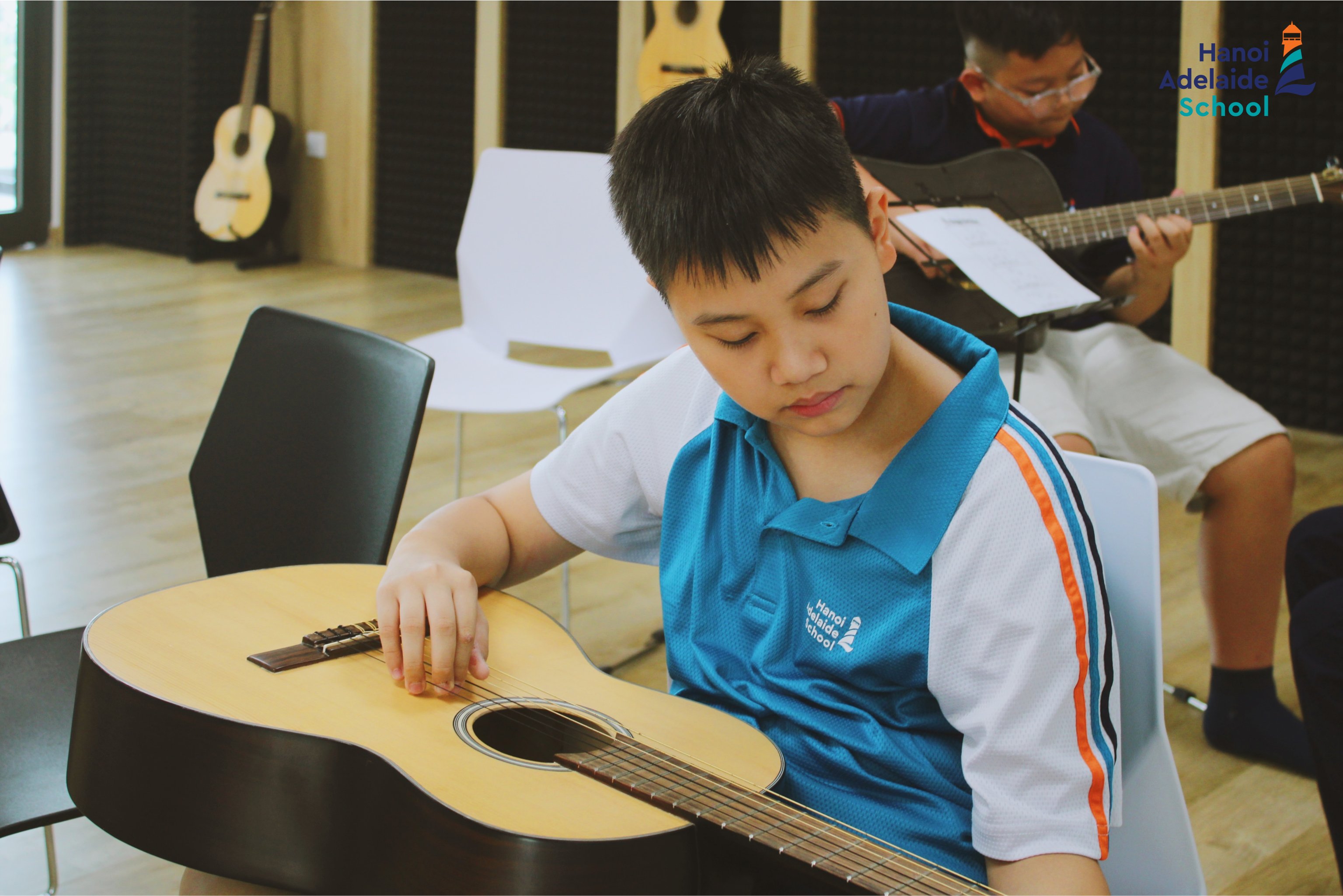 Bên cạnh những giai điệu sôi động, rộn ràng của trống, hay du dương của đàn piano, học sinh Hanoi Adelaide School cũng có những giờ phút “phiêu” cùng với giai điệu mộc mạc của đàn guitar.