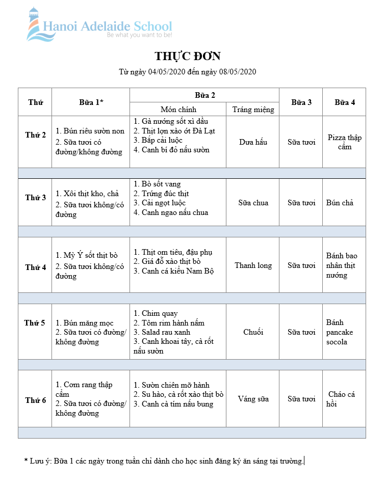 Thực đơn THCS (Từ ngày 4/5/2020 đến ngày 8/5/2020)