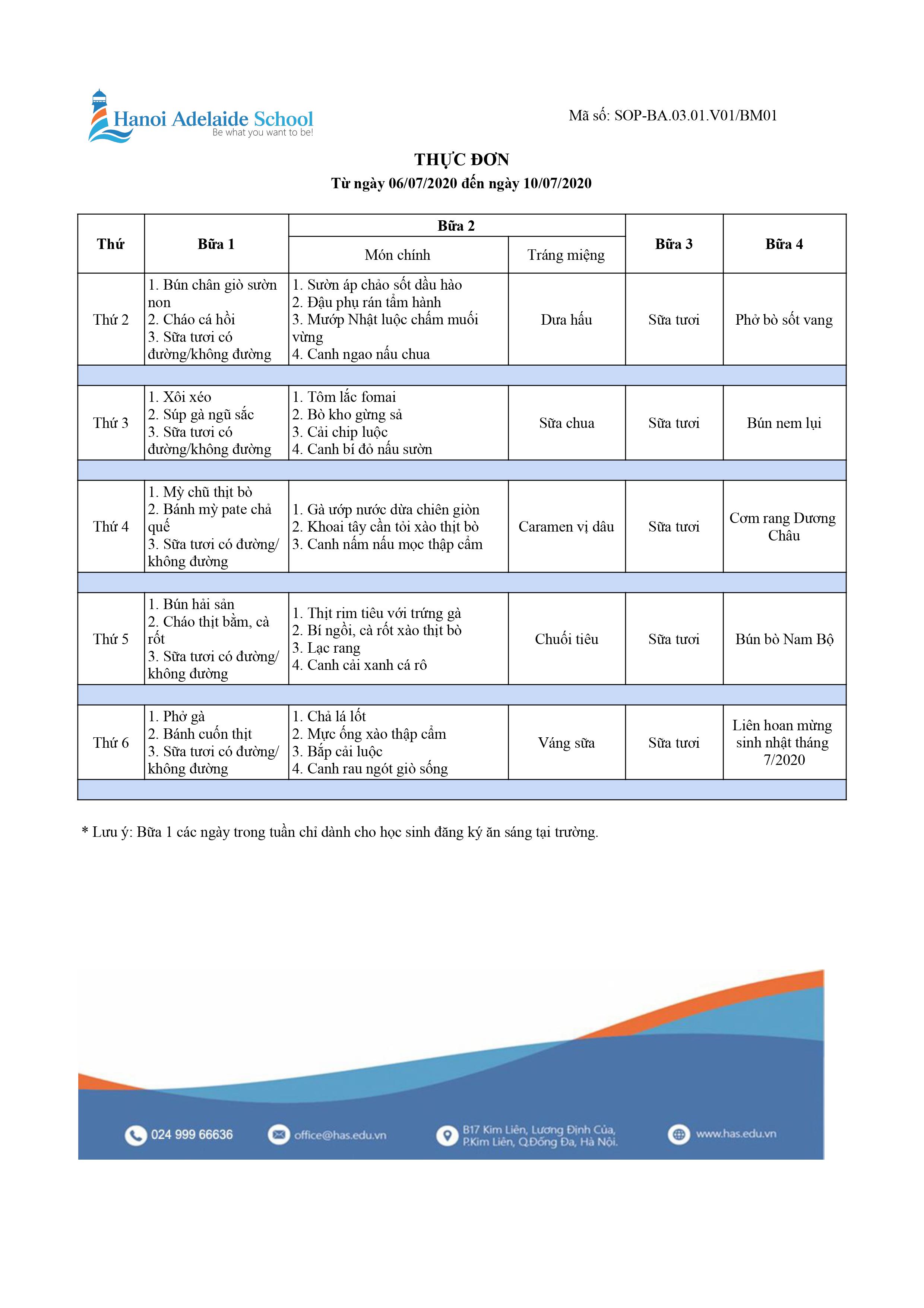 Thực đơn Tiểu học & THCS (Từ ngày 06/07/2020 đến ngày 10/07/2020)
