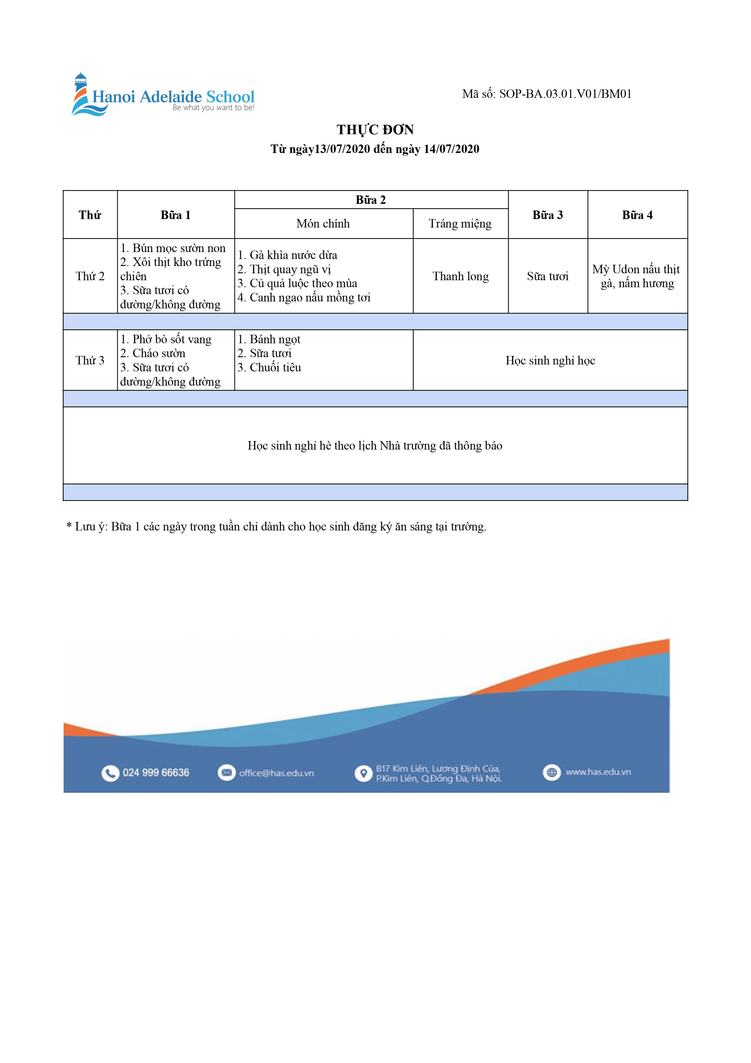 Thực đơn Tiểu học & THCS (Từ ngày 13/07/2020 đến ngày 14/07/2020)