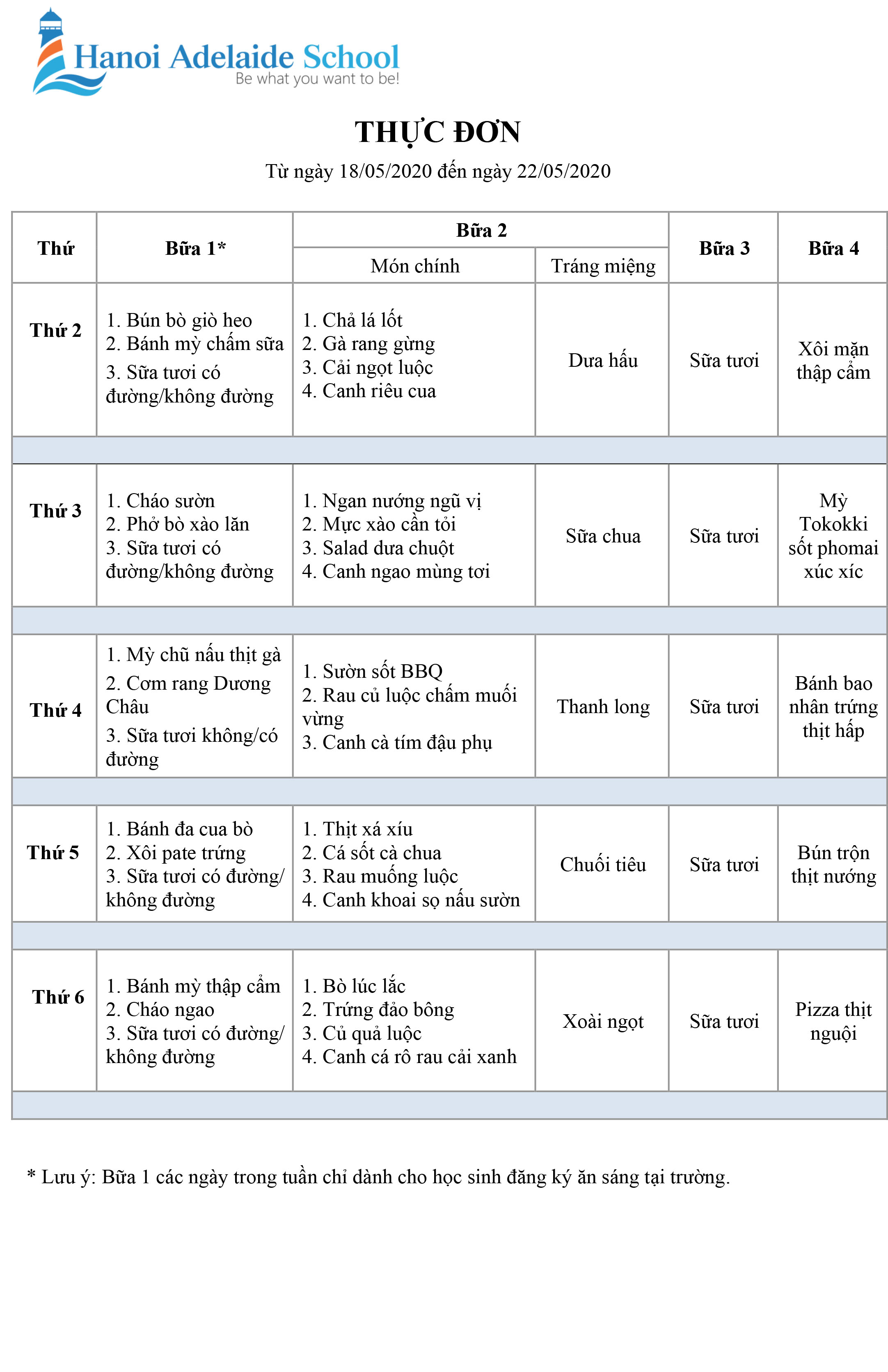 Thực đơn Tiểu học & THCS (Từ ngày 18/5/2020 đến ngày 22/5/2020)