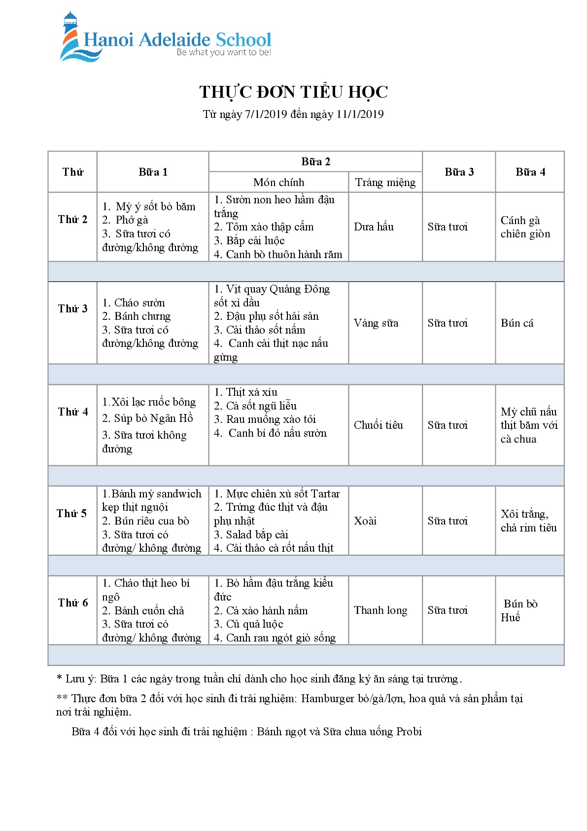 Thực đơn tiểu học (từ 07/01/2019 đến 11/01/2019)