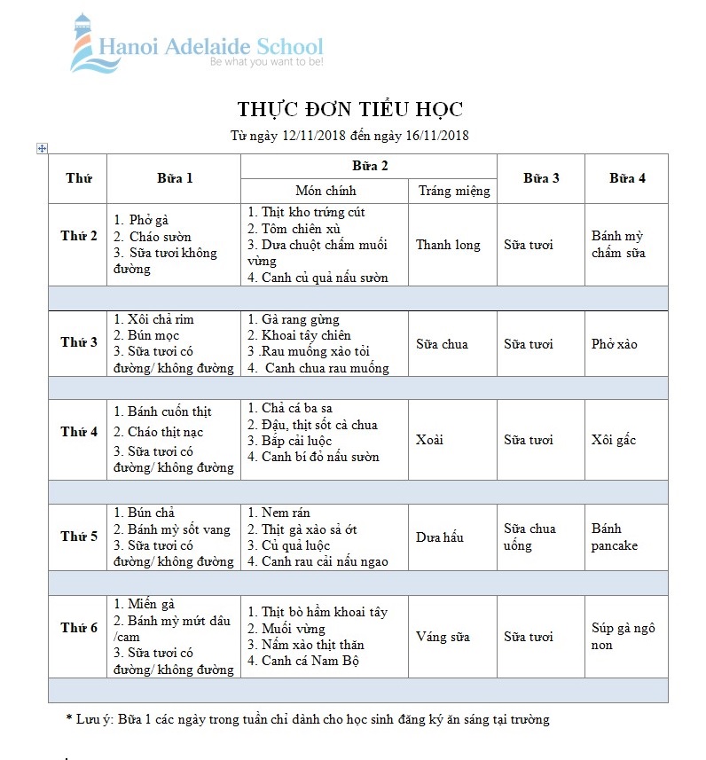 Thực đơn tiểu học (từ 12/11/2018 đến 16/11/2018)