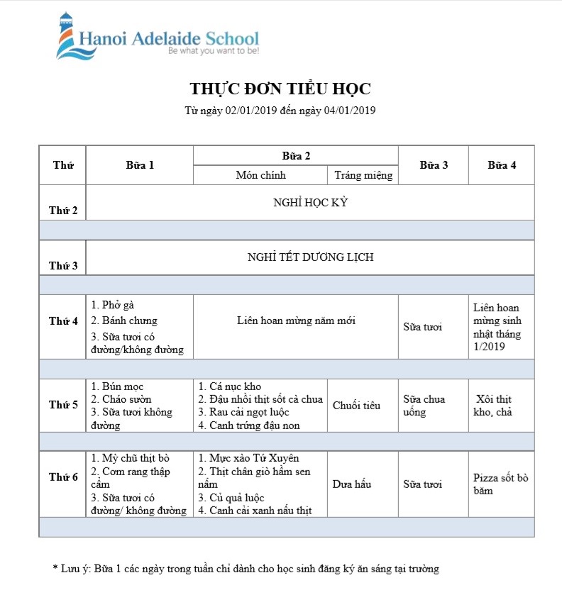 Thực đơn tiểu học (từ 2/1/2019 đến 4/1/2019)