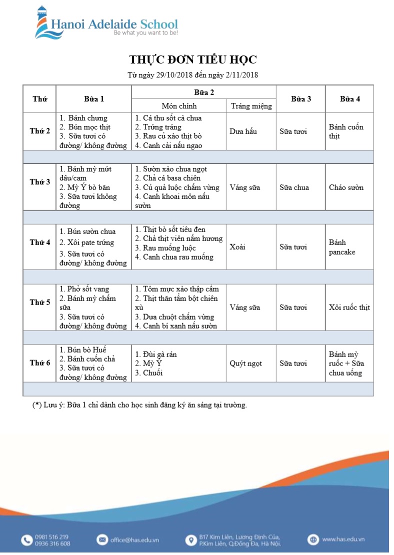 Thực đơn tiểu học (từ 29/10/2018 đến 2/11/2018)