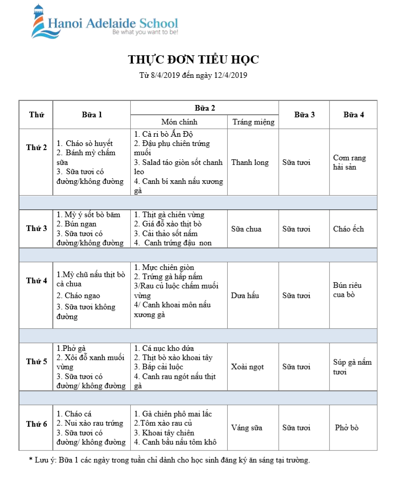 Thực đơn tiểu học (từ 8/4/2019 đến 12/4/2019)