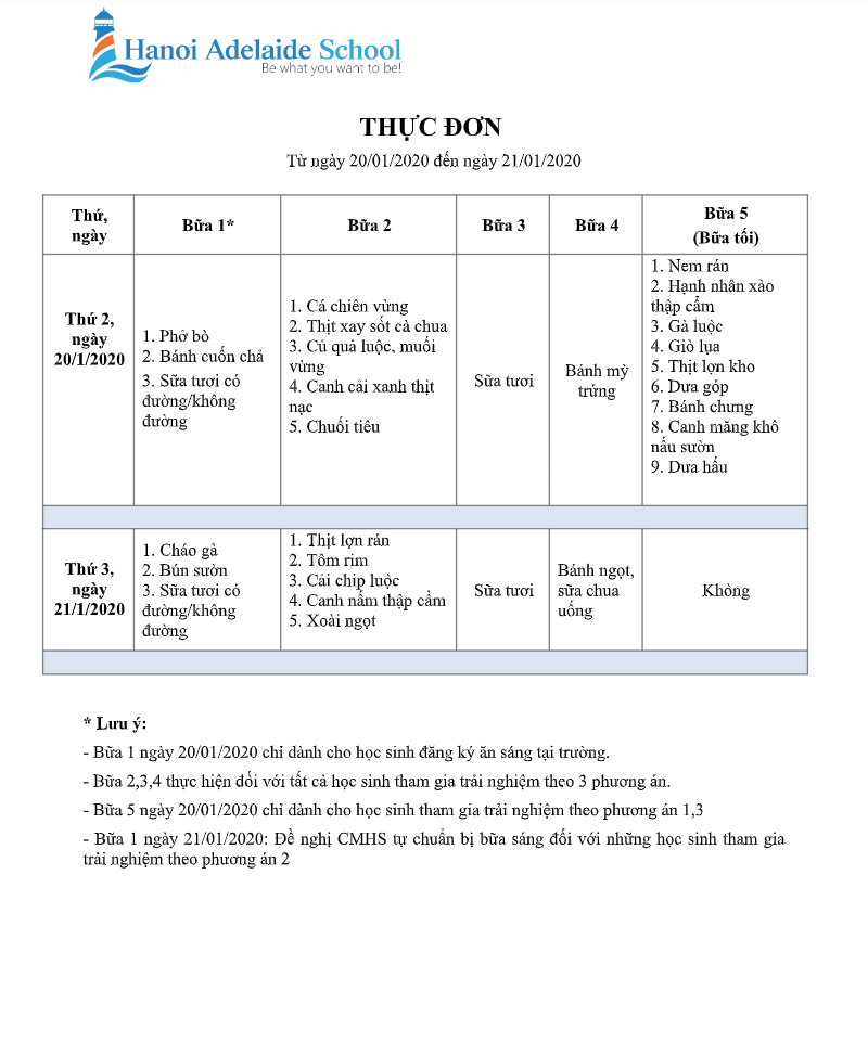 Thực đơn Tiểu học và THCS (Ngày 20 & 21/01/2020)
