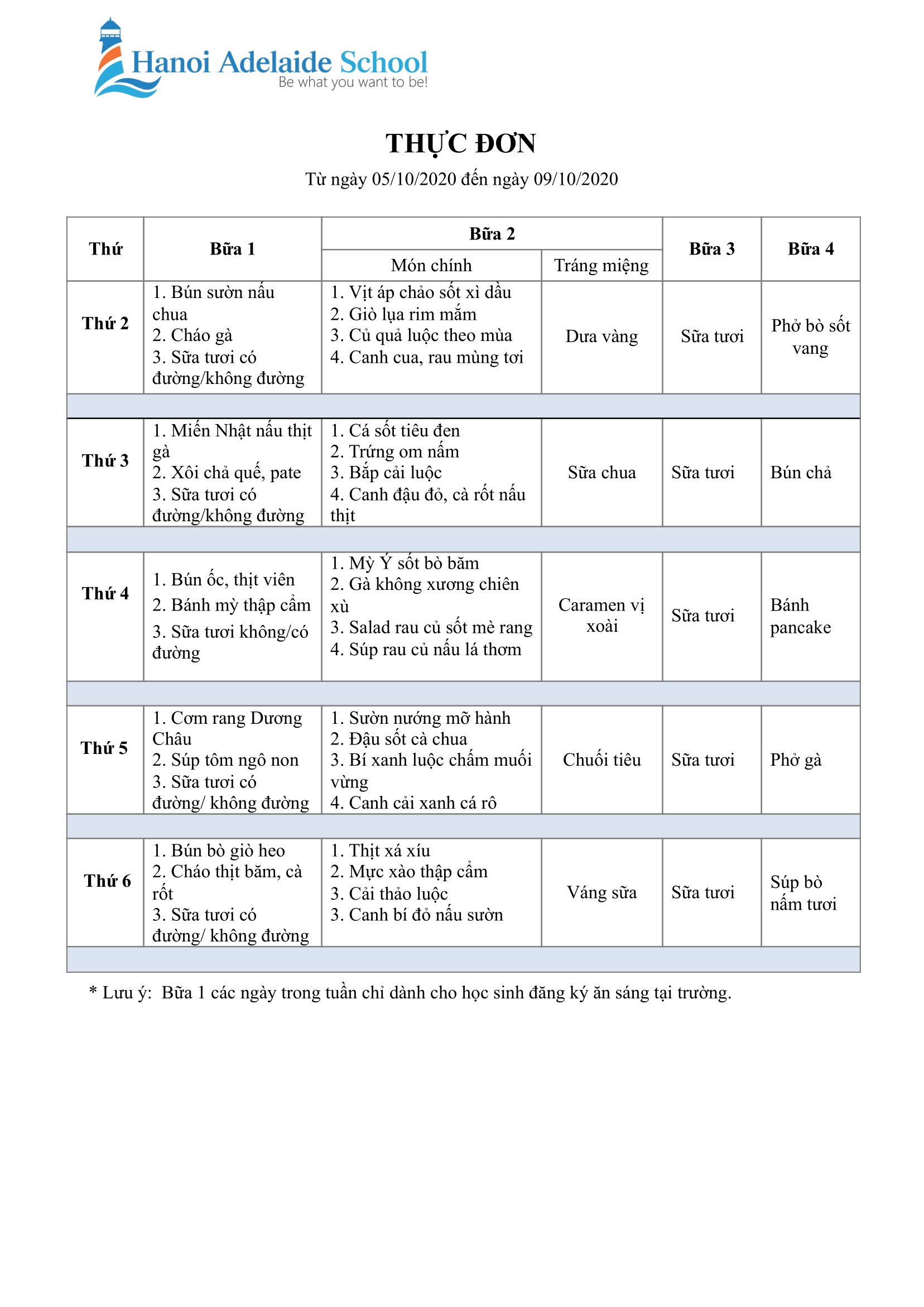 Thực đơn (Từ ngày 05/10/2020 đến ngày 09/10/2020)
