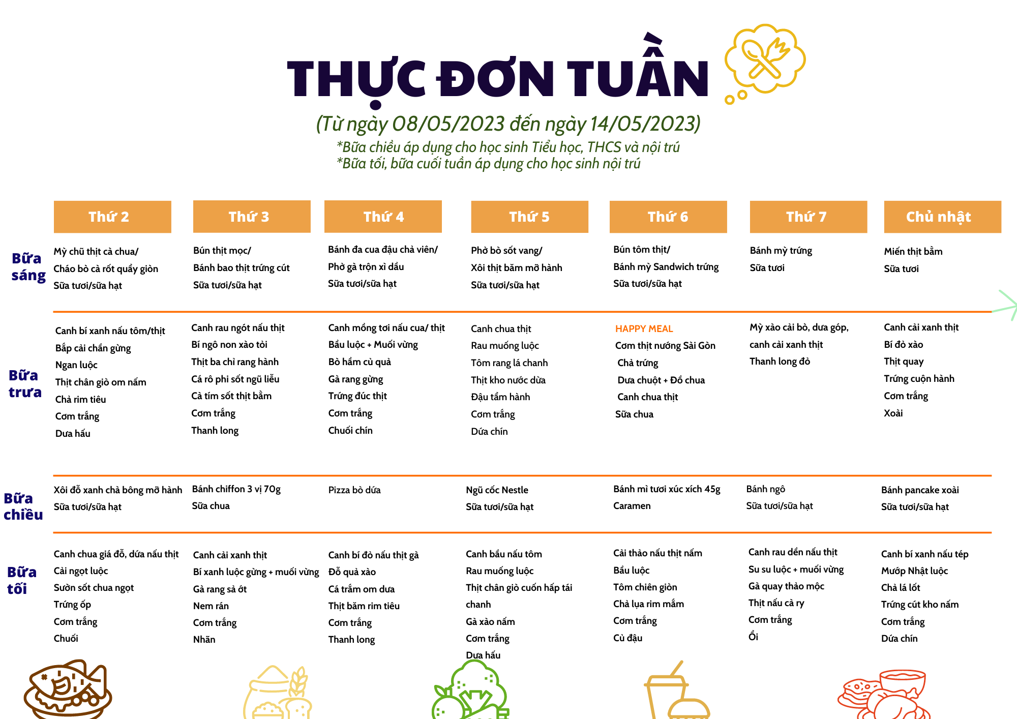 Thực đơn từ ngày 08/05/2023 đến ngày 14/05/2023