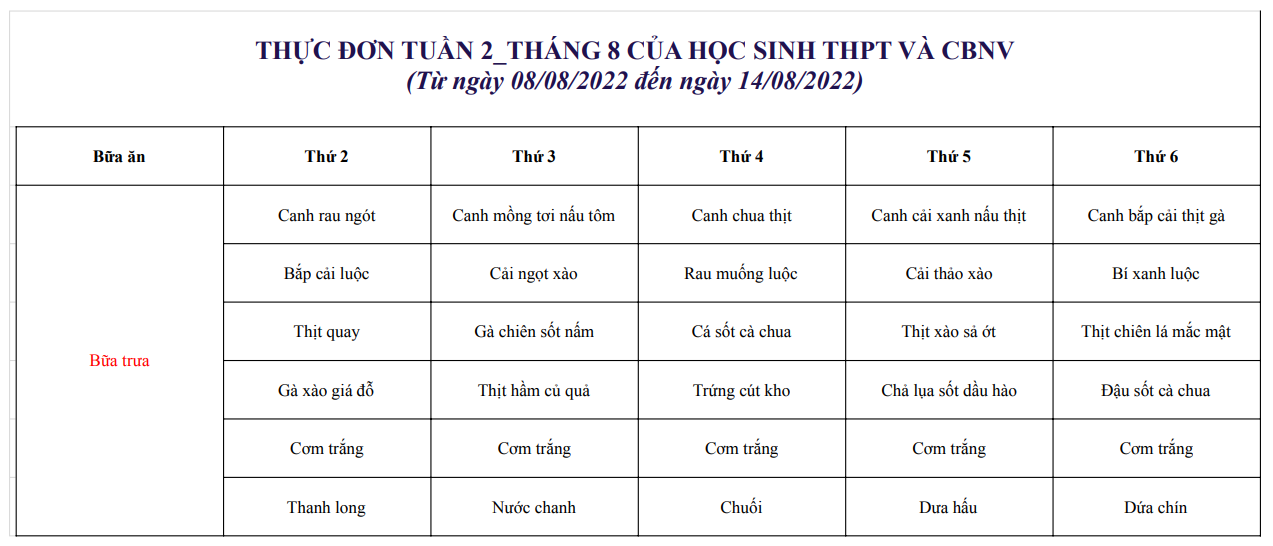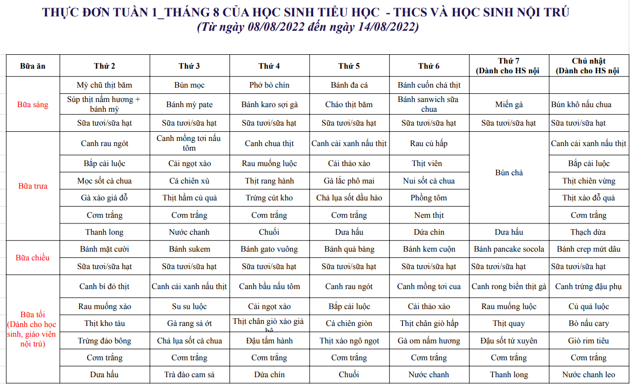 Thực đơn từ ngày 08/08/2022 đến ngày 14/08/2022