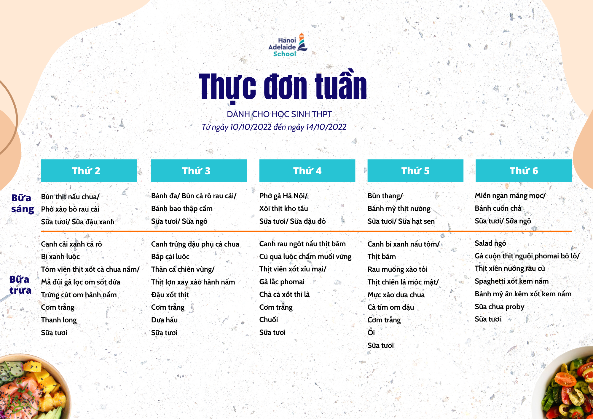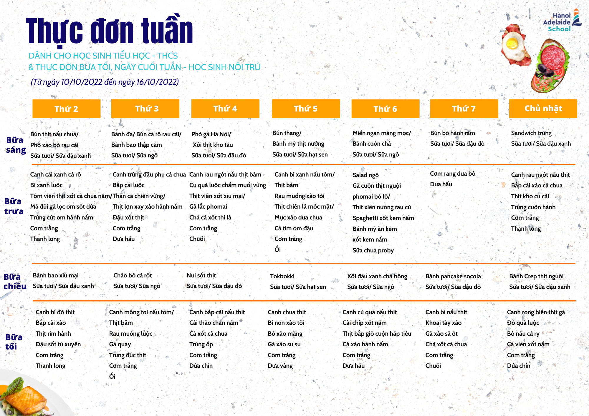Thực đơn từ ngày 10/10/2022 đến ngày 16/10/2022