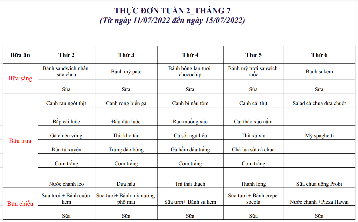 Thực đơn từ ngày 11/07/2022 đến ngày 15/07/2022