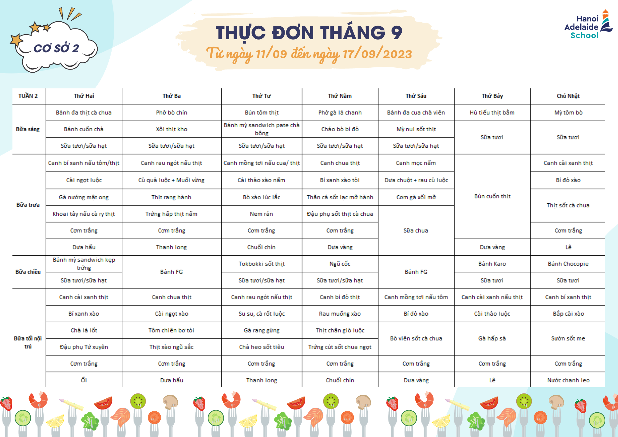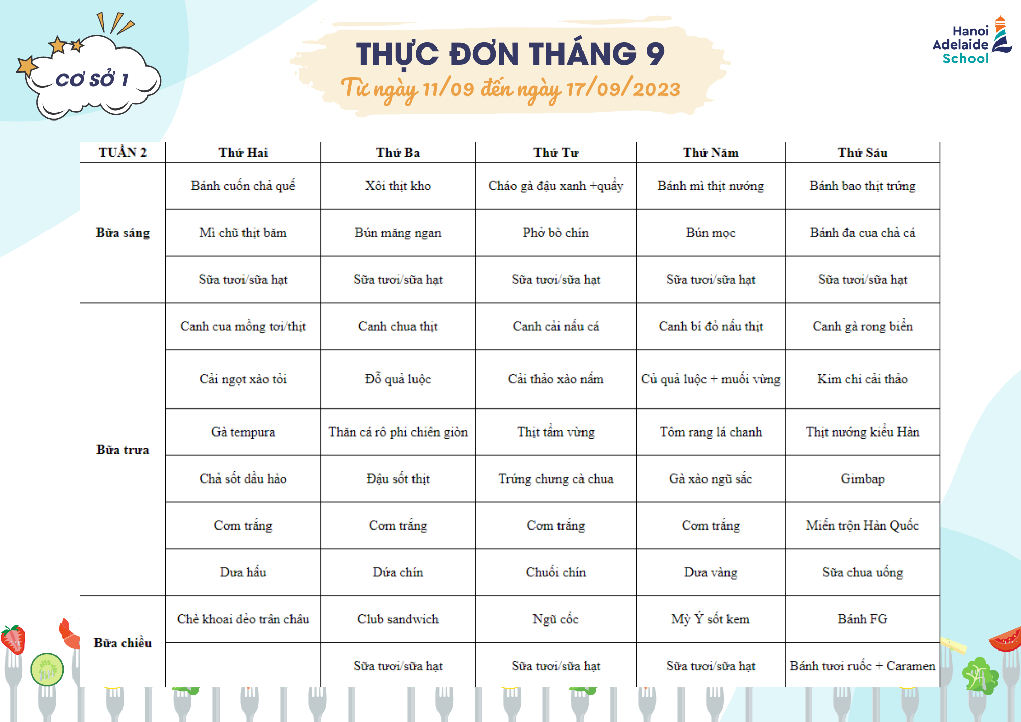 Thực đơn từ ngày 11/09 đến ngày 17/09/2023