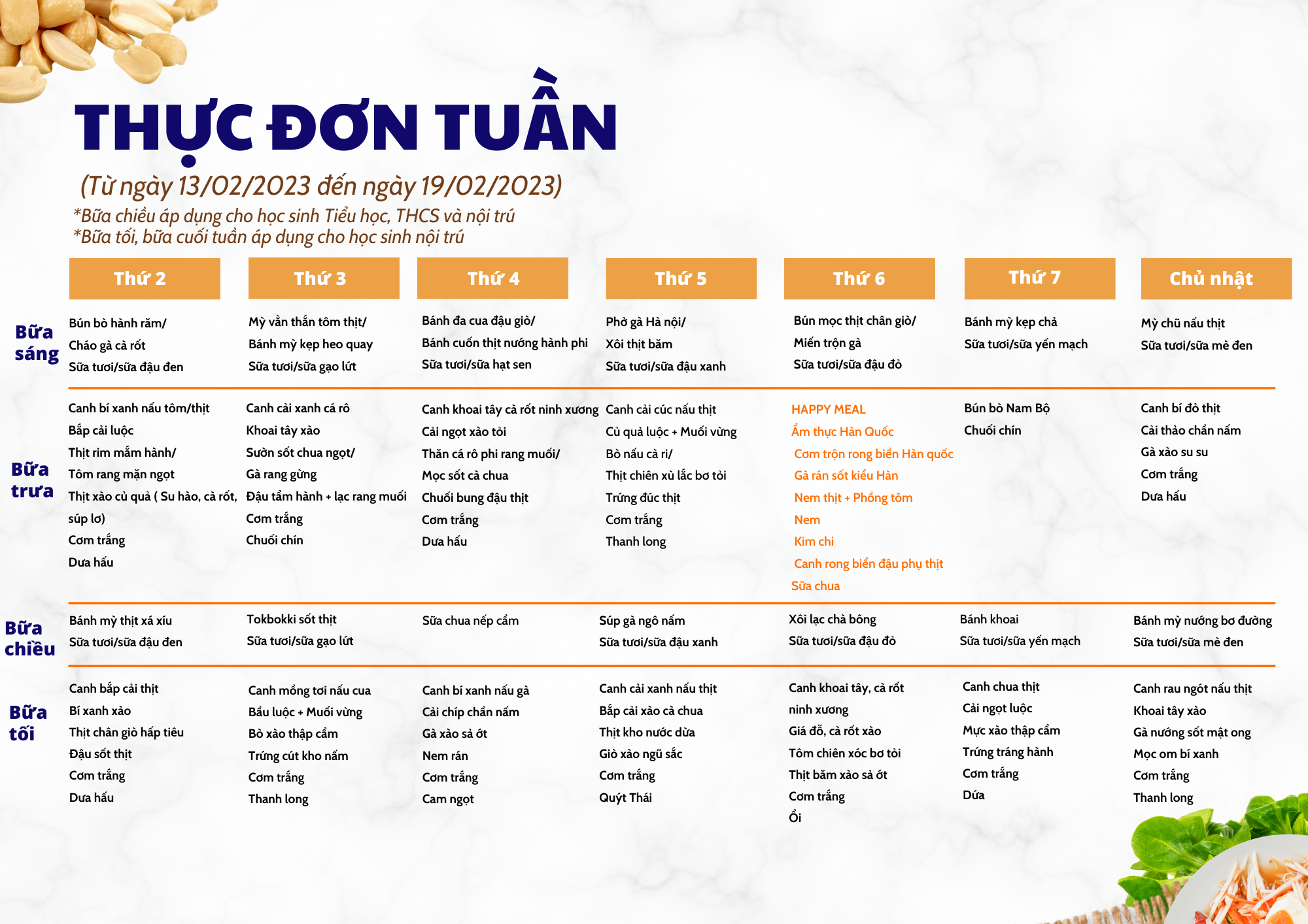 Thực đơn từ ngày 13/02/2023 đến ngày 19/02/2023