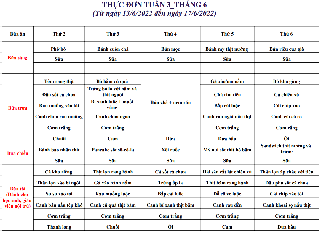 Thực đơn từ ngày 13/6/2022 đến ngày 17/6/2022