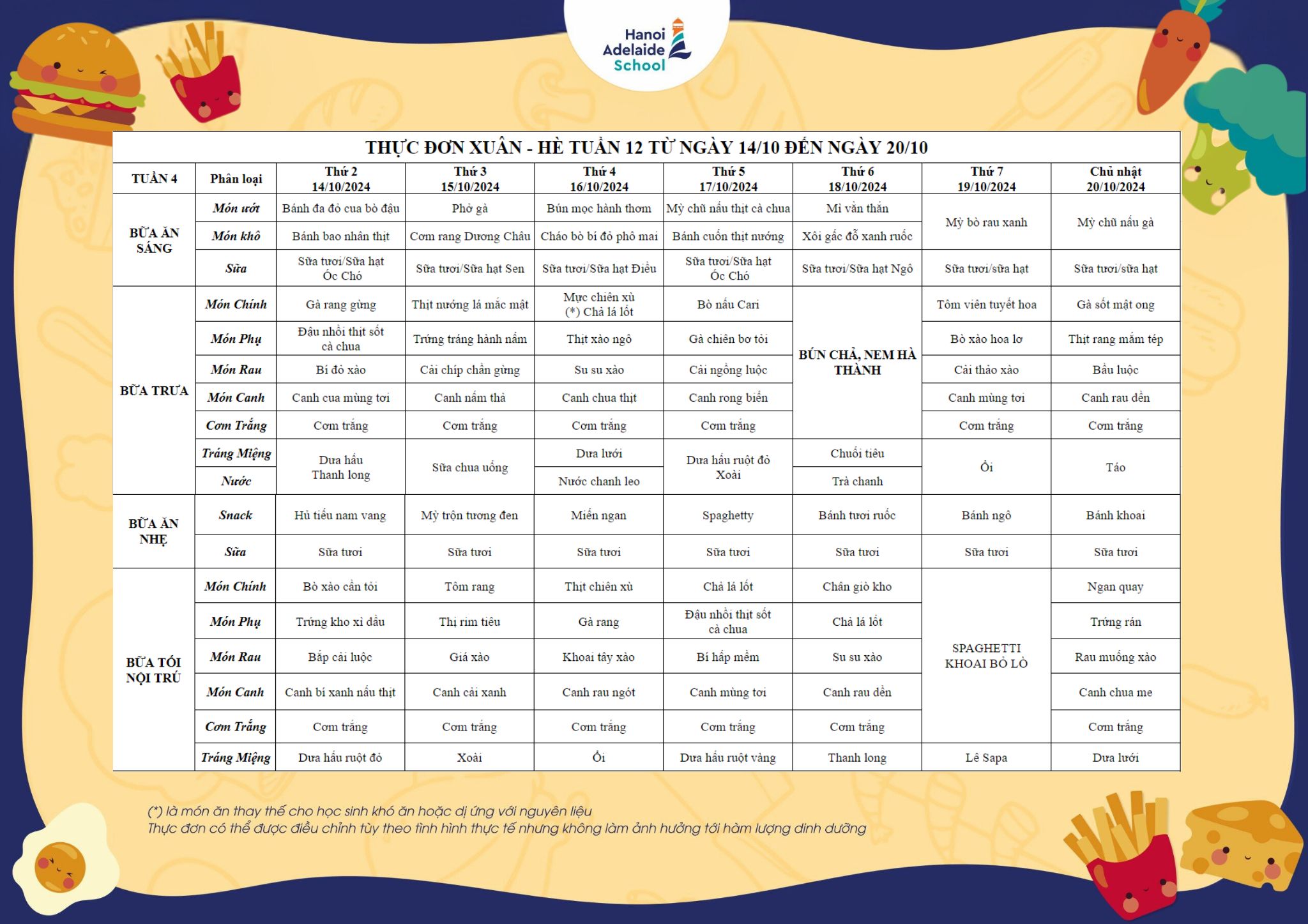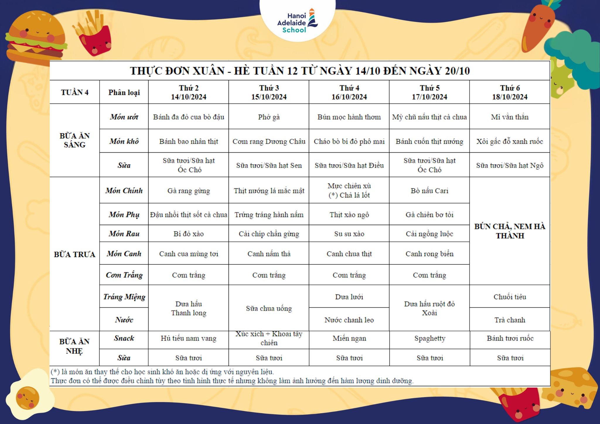 Thực đơn từ ngày 14/10/2024 đến ngày 20/10/2024