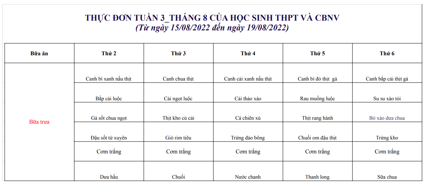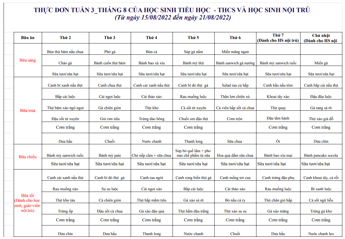 Thực đơn từ ngày 15/08/2022 đến ngày 21/08/2022