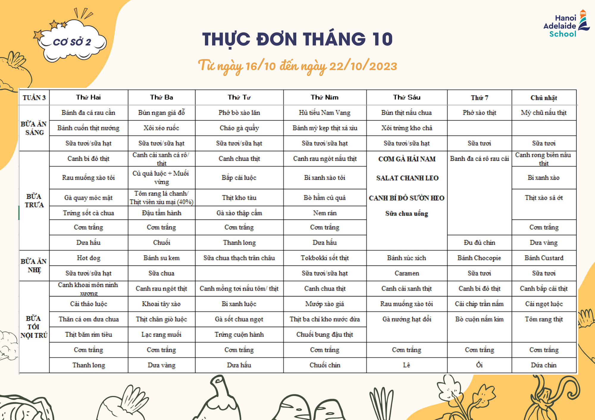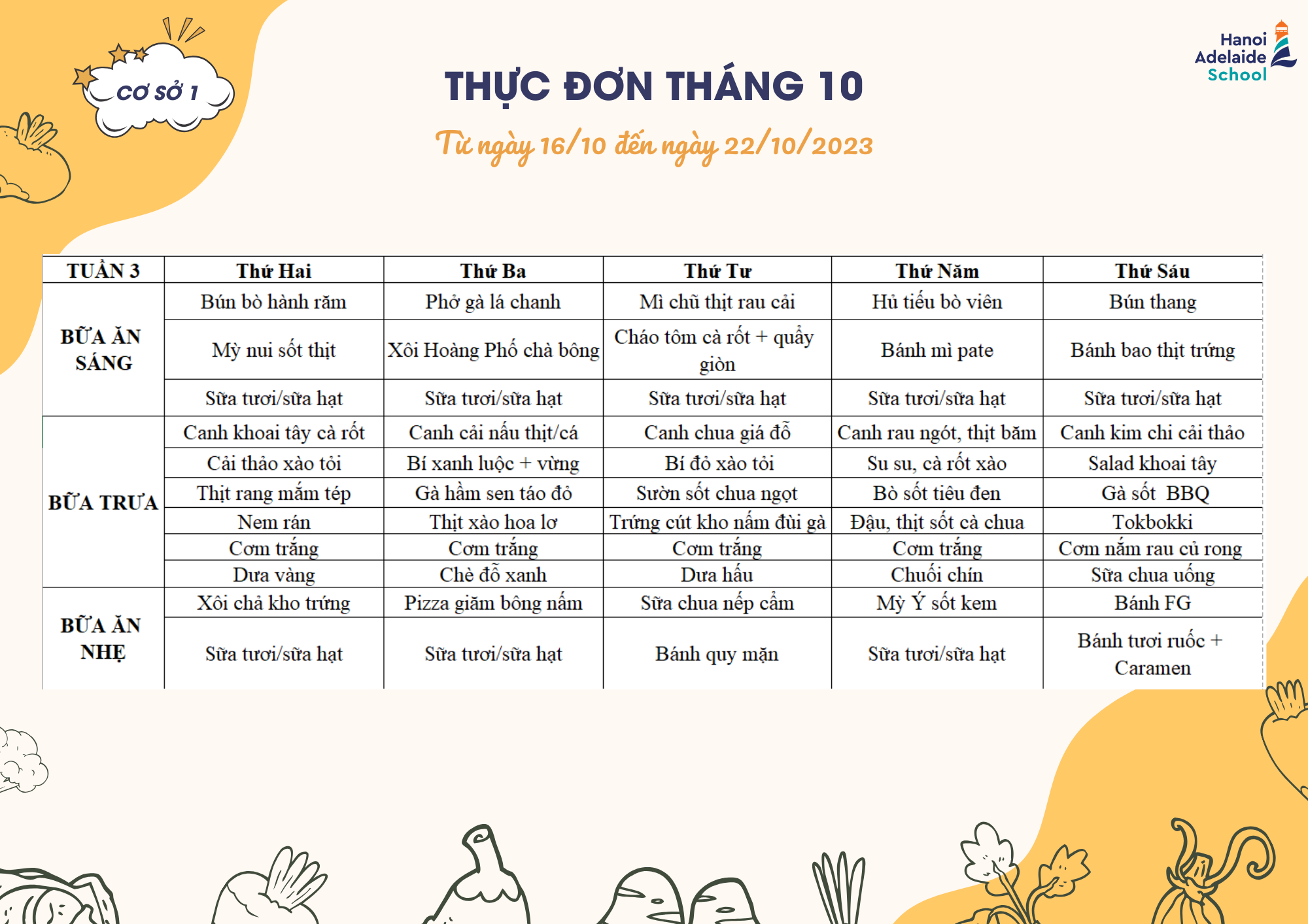 Thực đơn từ ngày 16/10 đến ngày 22/10/2023