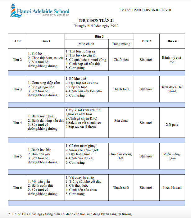 Thực đơn (Từ ngày 21/12/2020 đến ngày 25/12/2020)