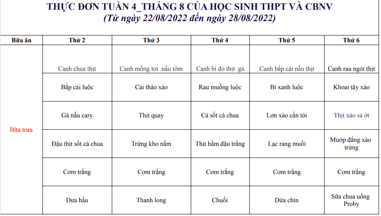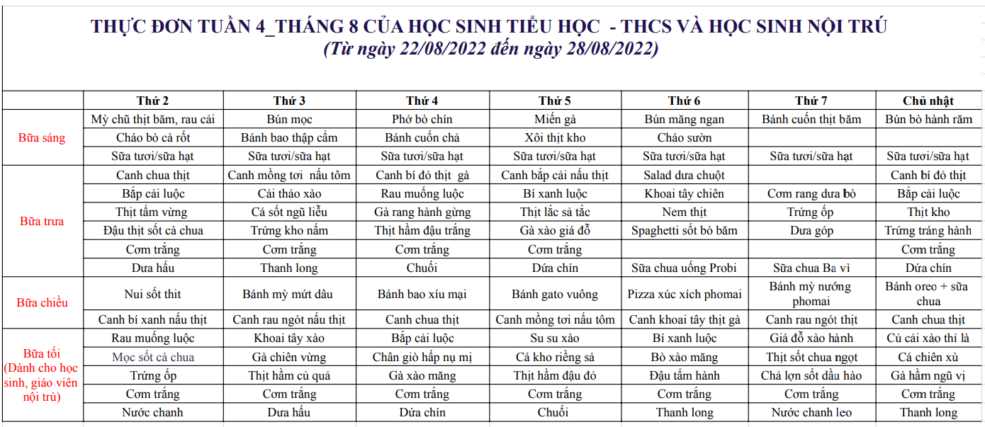 Thực đơn từ ngày 22/08/2022 đến ngày 28/08/2022