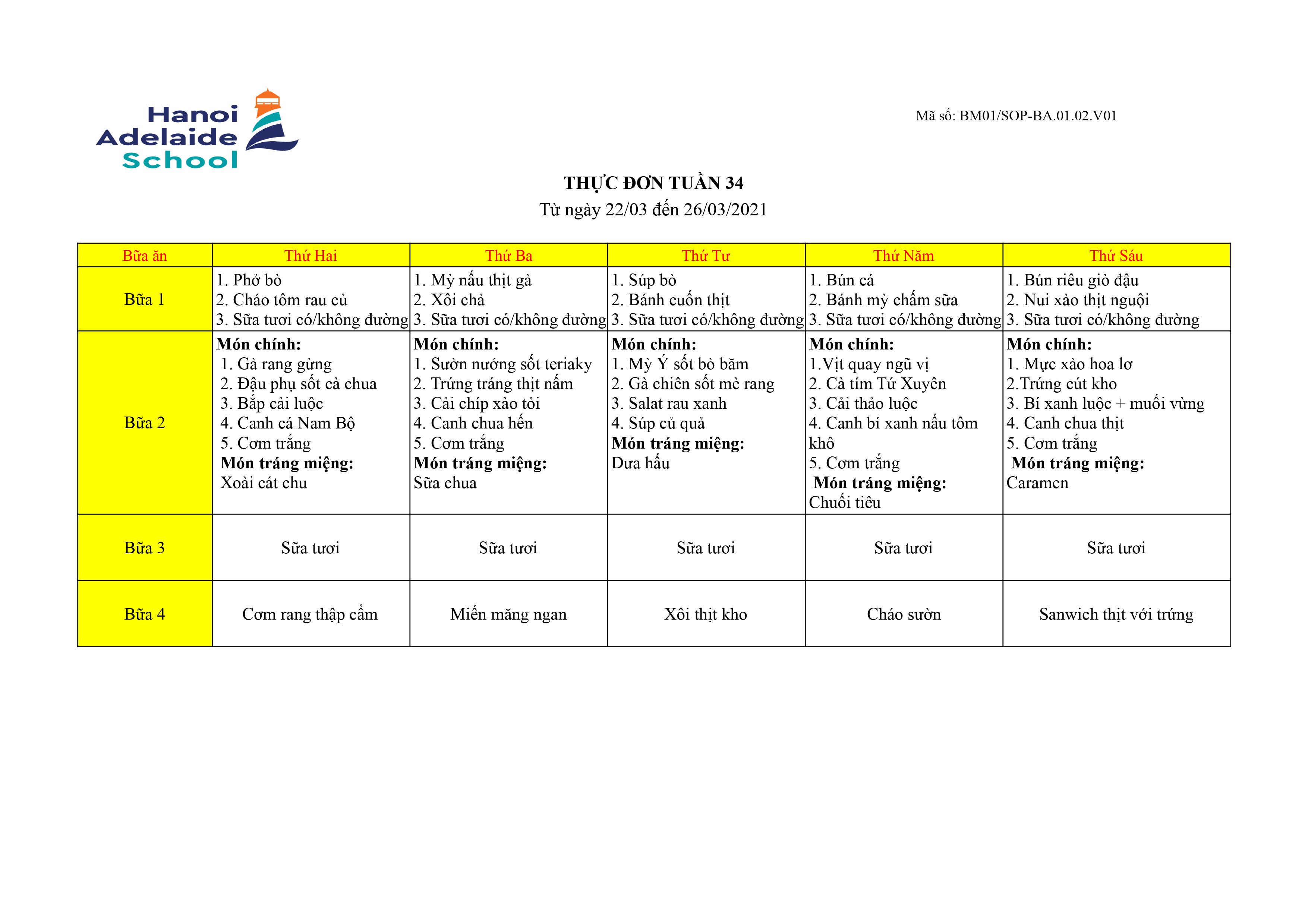 Thực đơn từ ngày 22/3/2021 đến 26/3/2021