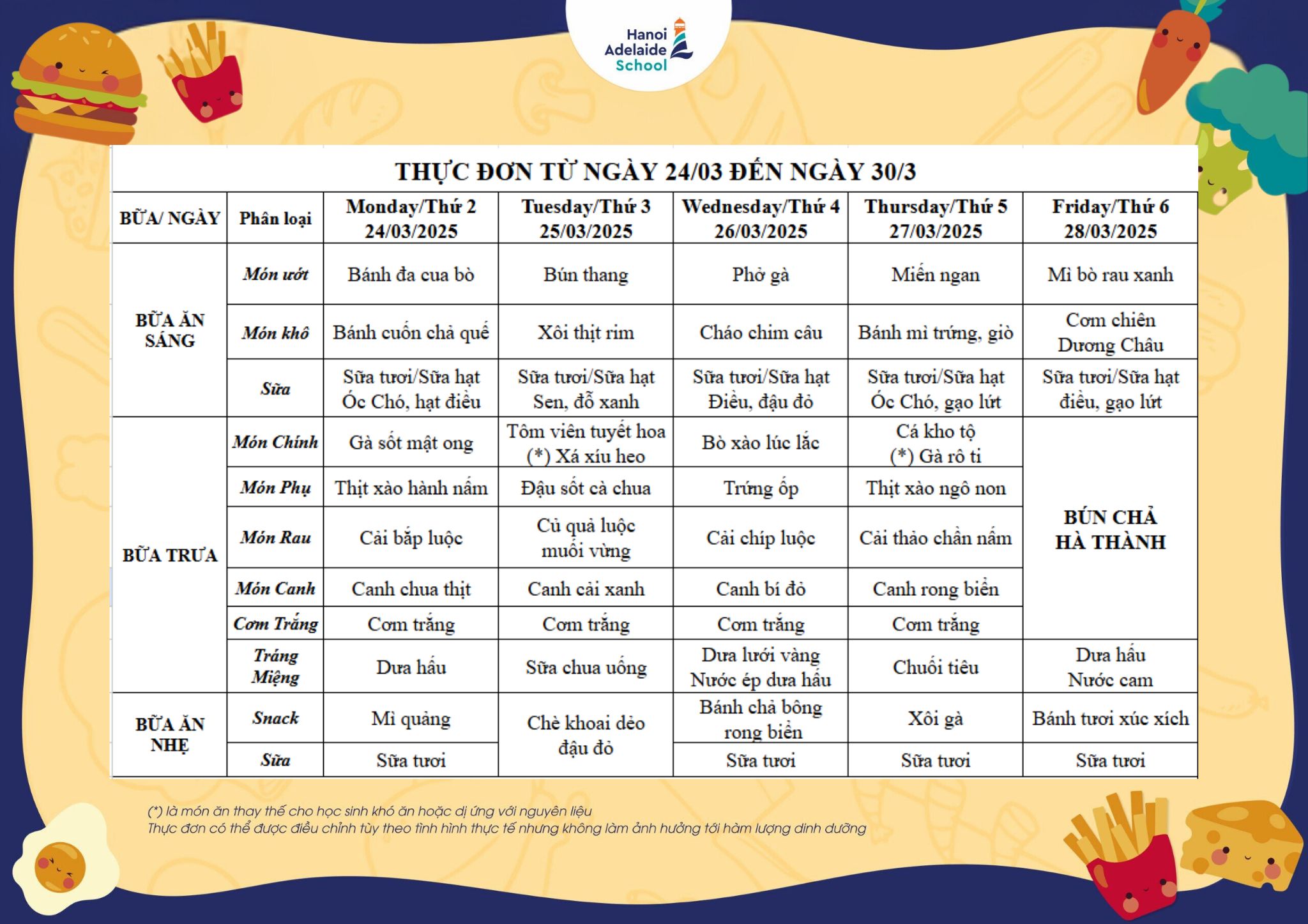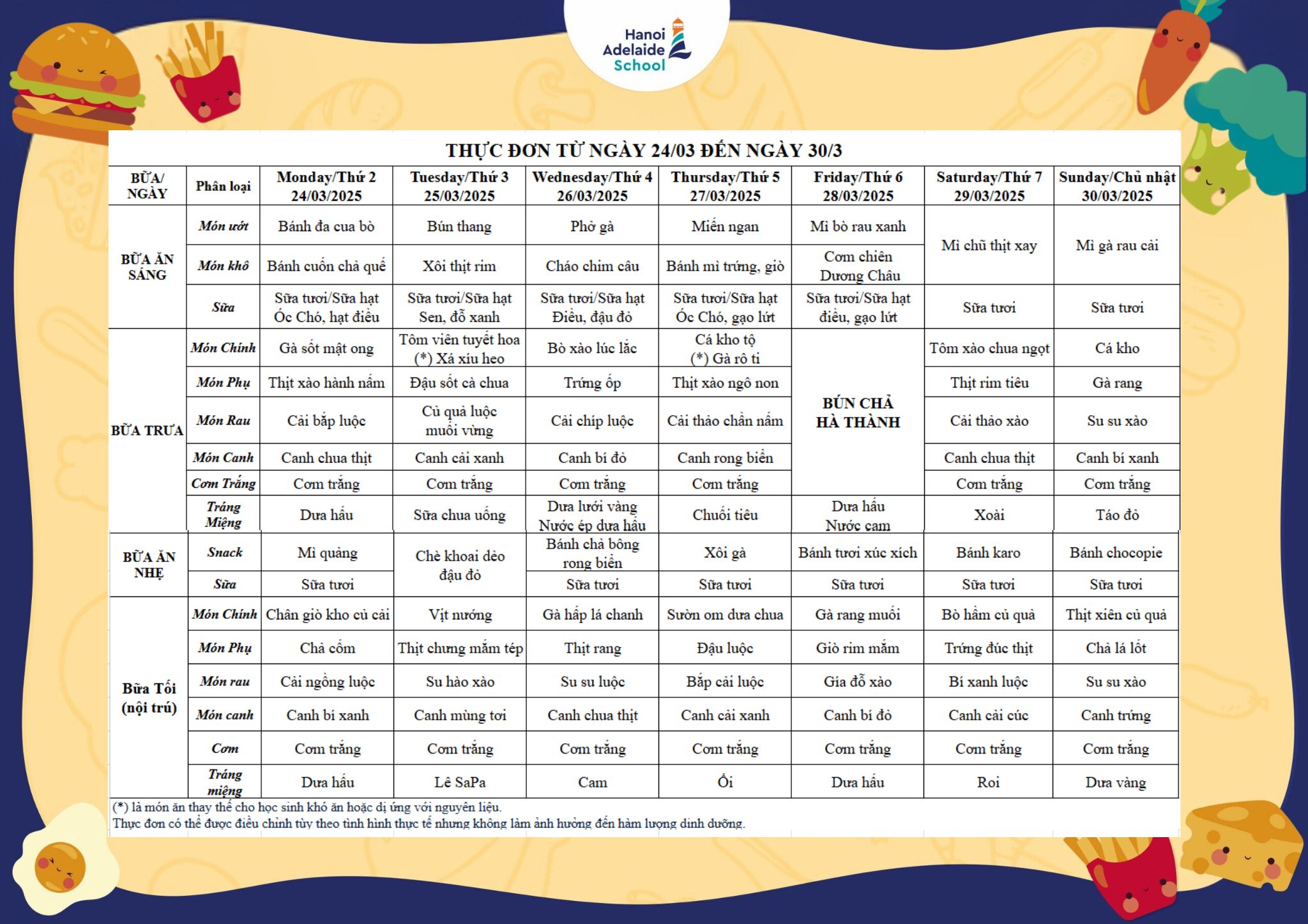 Thực đơn từ ngày 24/03/2025 đến ngày 30/03/2025