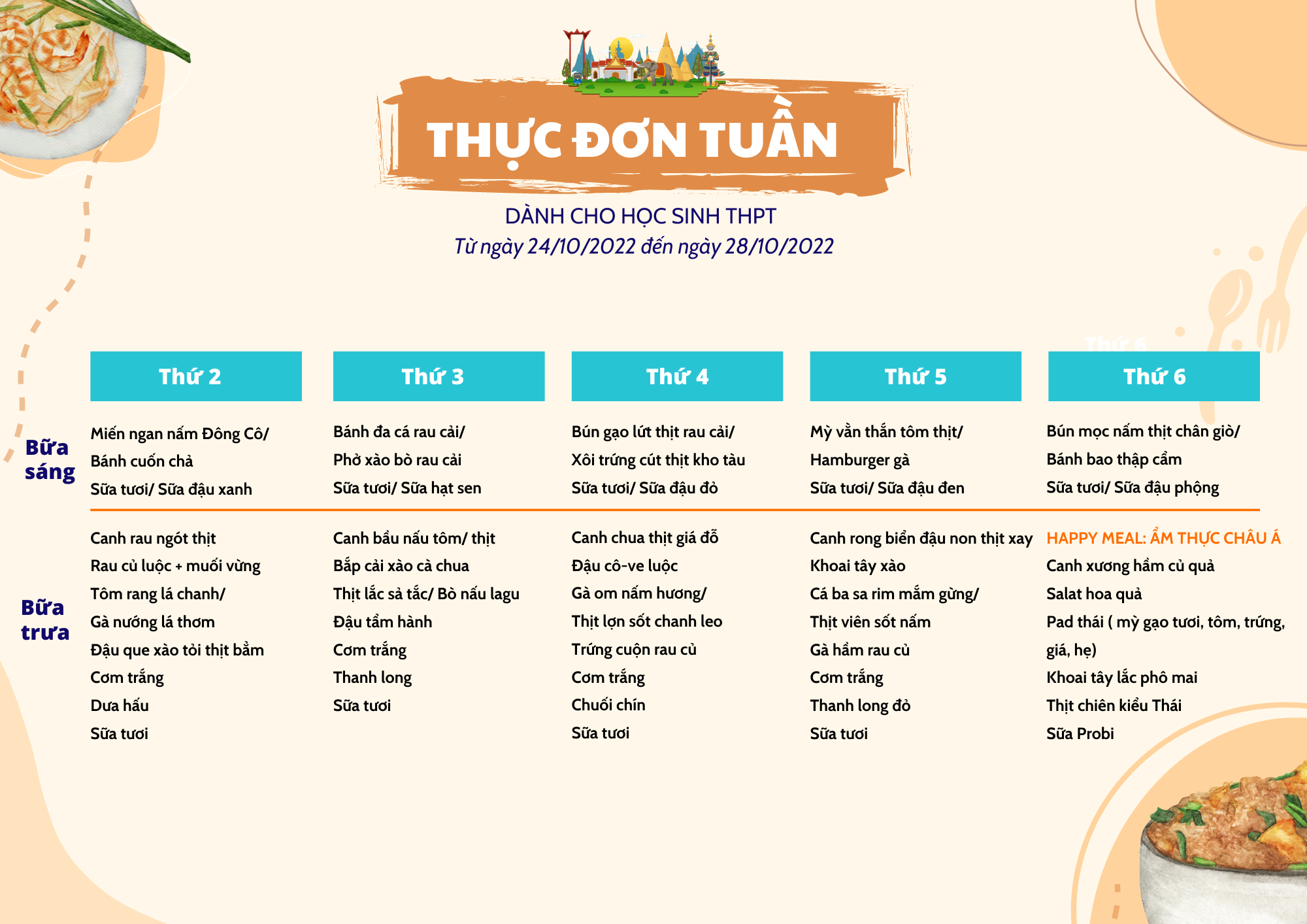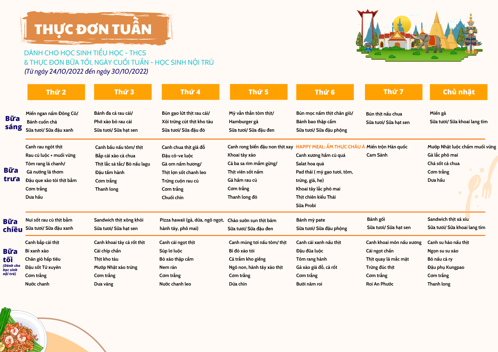 Thực đơn từ ngày 24/10/2022 đến ngày 30/10/2022