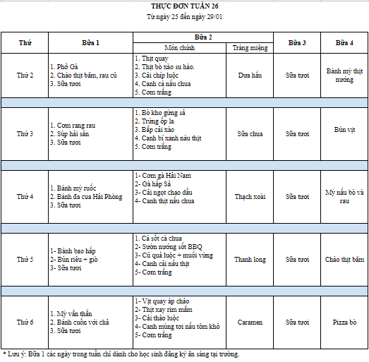 Thực đơn (Từ ngày 25/01/2021 đến ngày 29/01/2021)