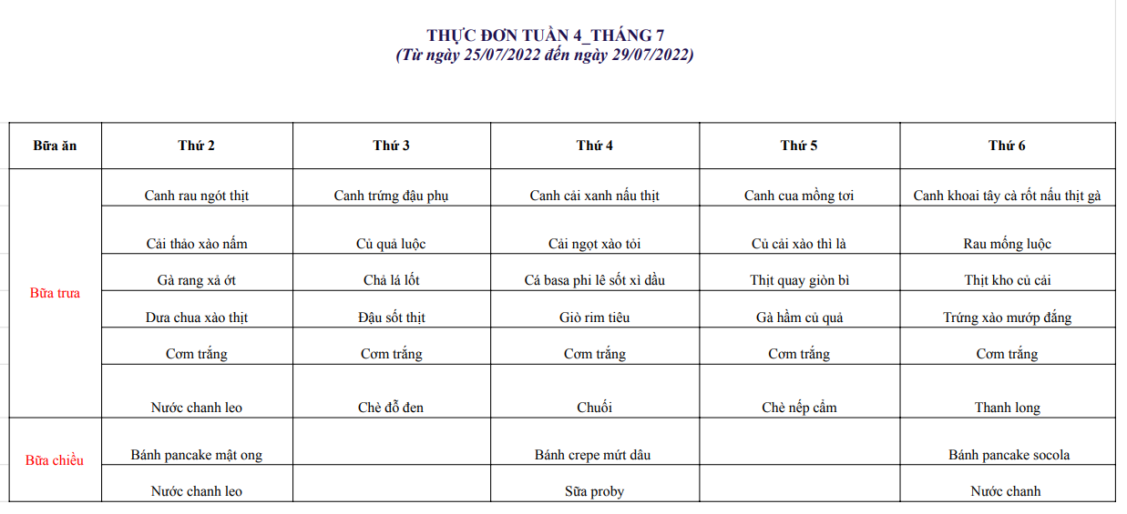 Thực đơn từ ngày 25/07/2022 đến ngày 29/07/2022