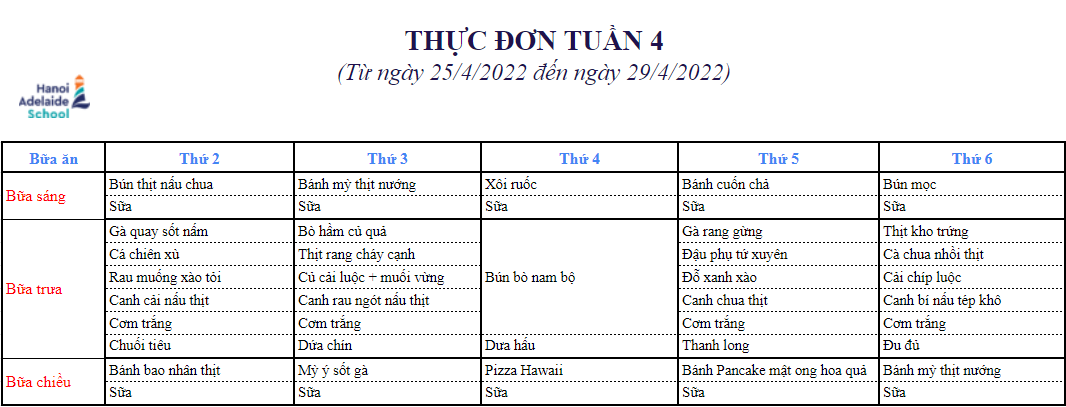 Thực đơn từ ngày 25/4/2022 đến ngày 29/4/2022