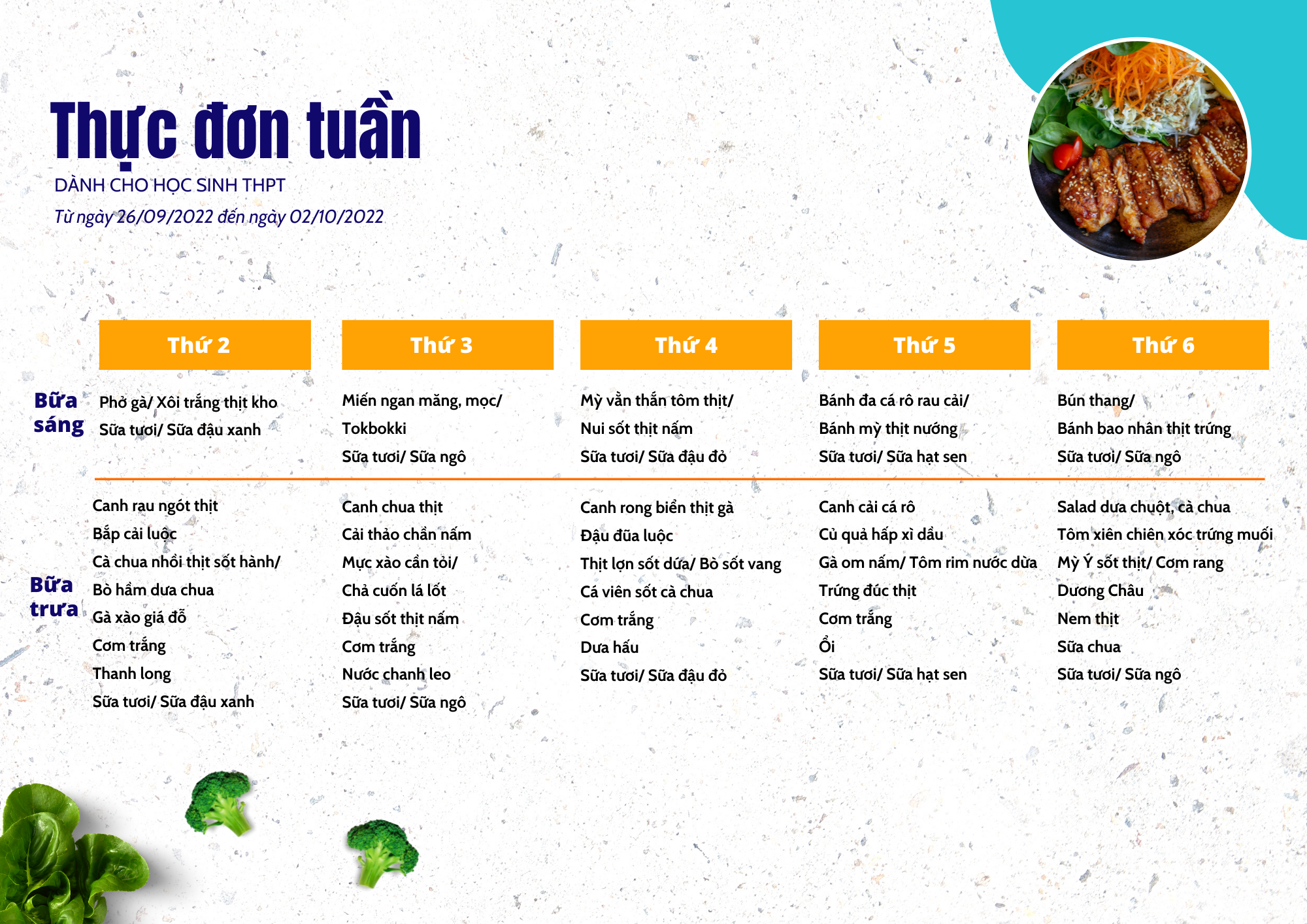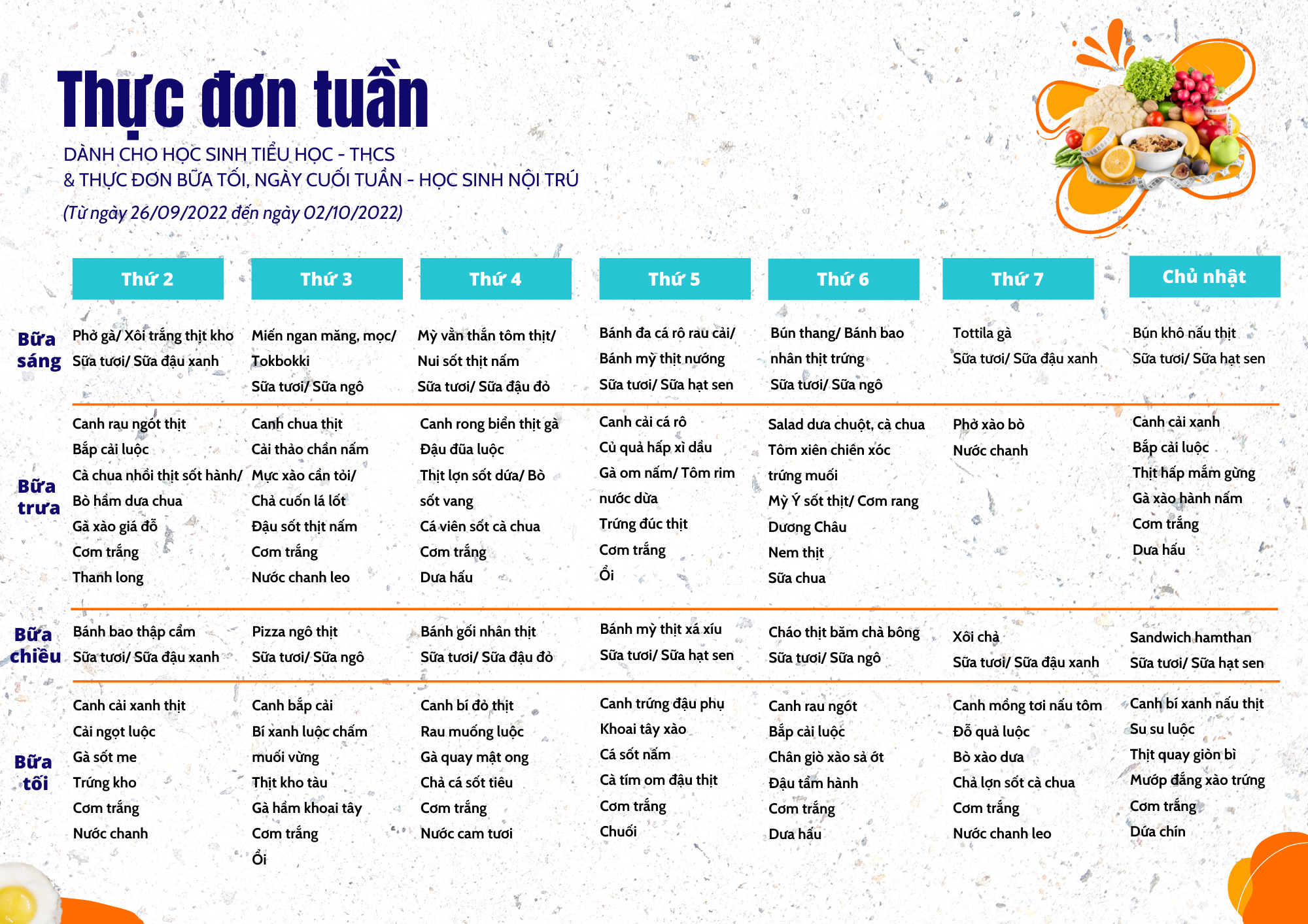 Thực đơn từ ngày 26/09/2022 đến ngày 02/10/2022
