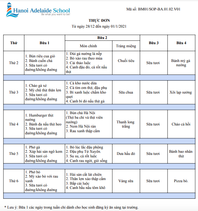 Thực đơn (Từ ngày 28/12/2020 đến ngày 01/01/2021)