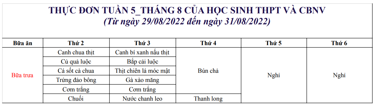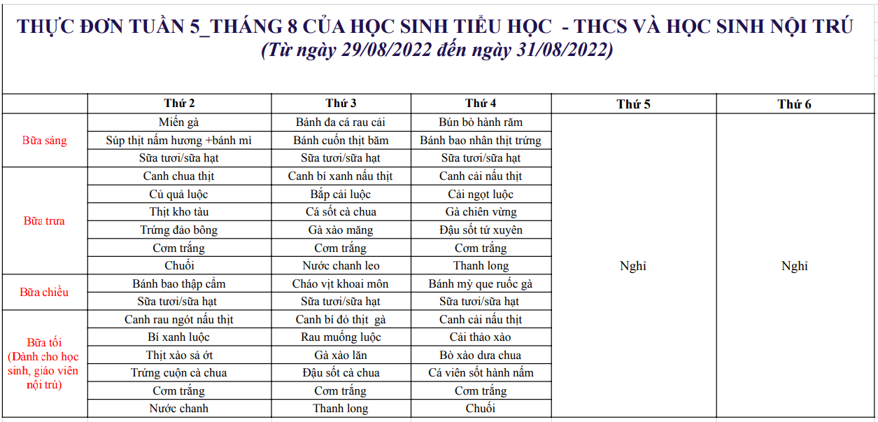 Thực đơn từ ngày 29/8/2022 đến ngày 31/8/2022