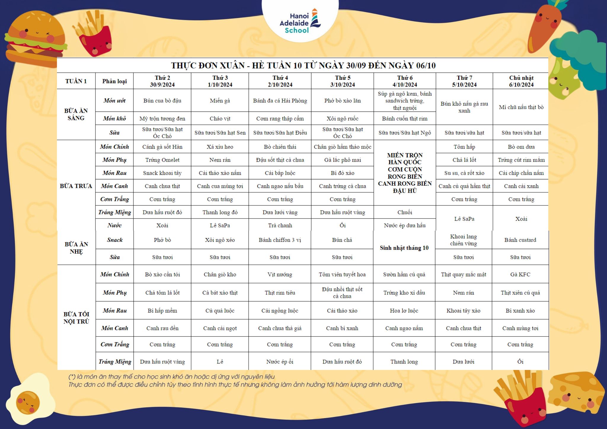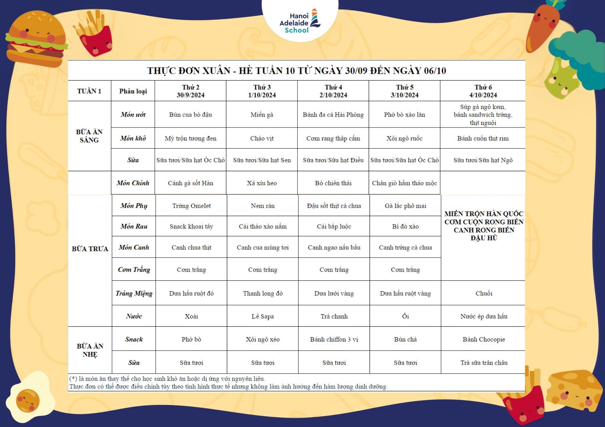 Thực đơn từ ngày 30/09/2024 đến ngày 06/10/2024